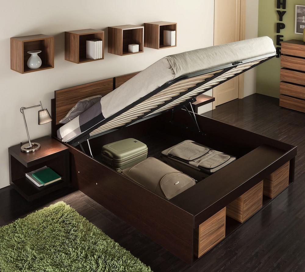Под основанием с подъемным механизмом скрывается две просторные ниши для постельного белья и прочих принадлежностей.