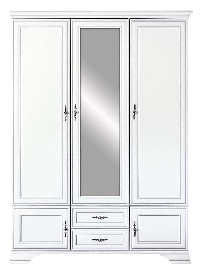 Шкаф Кентаки, укомплектован тремя распашными дверьми: боковые двери с глухими фасадами, средняя дверь с зеркальным фасадом.