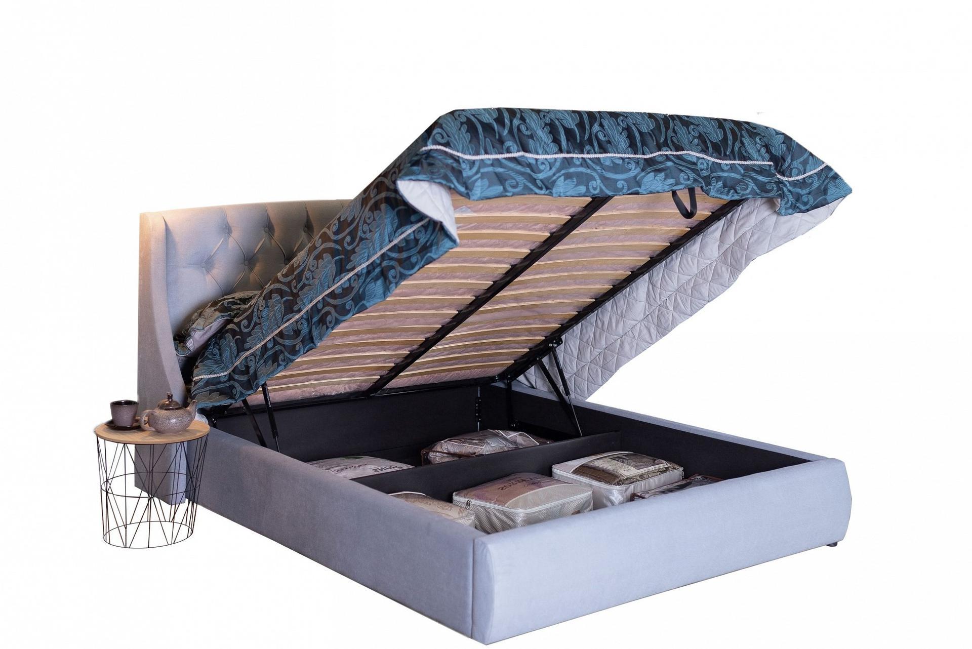 Ценители прекрасного поистине оценят мягкую интерьерную кровать Stefani из ткани с подъемным механизмом и высоким изголовьем.