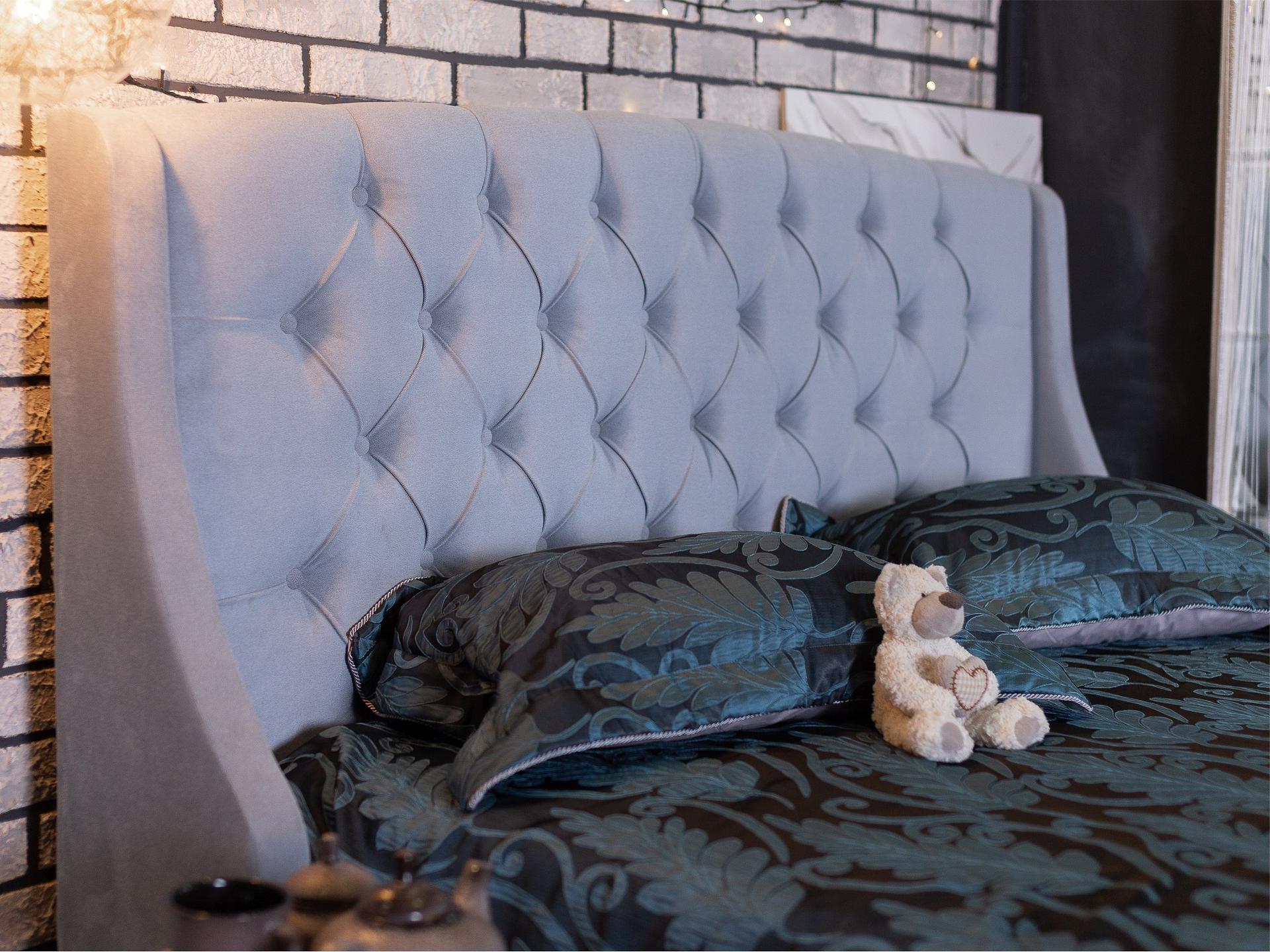 Основной акцент кровати сделан на высоком изголовье с мягкими боковинами – “ушками”. Мягкая спинка изящно оформлены каретной стяжкой с декоративными пуговицами в тон изголовья.