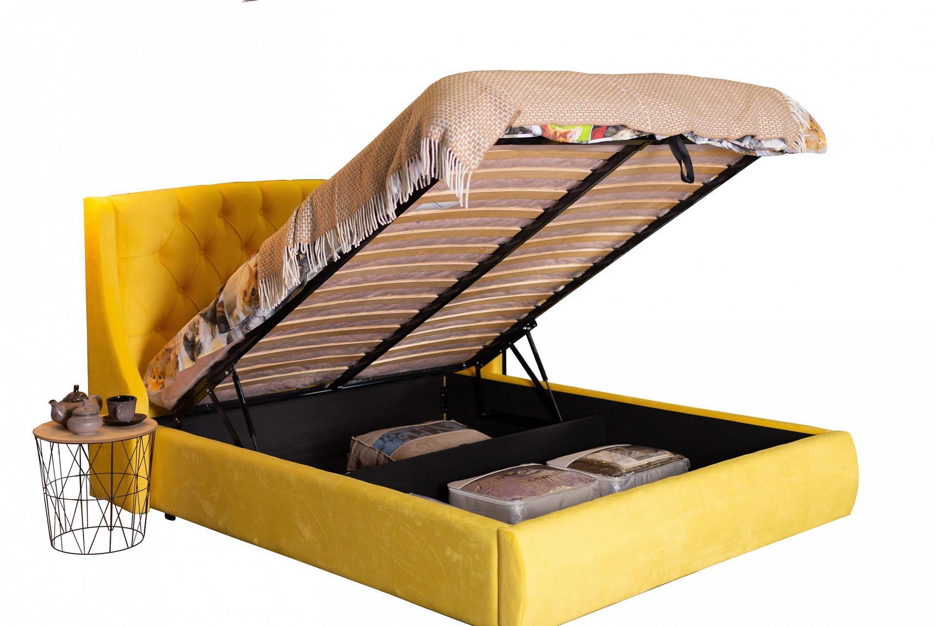 Ценители прекрасного поистине оценят мягкую интерьерную кровать Stefani из ткани с подъемным механизмом и высоким изголовьем.