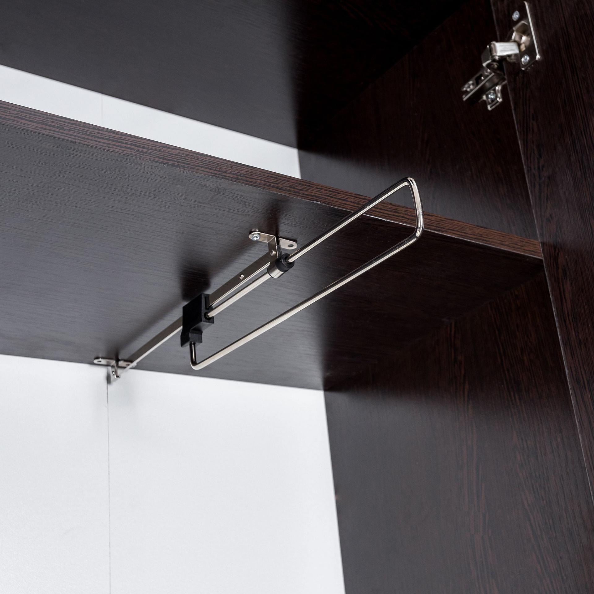 Стенка для прихожей Малави LST_2500000071379 создана известным производителем мебели Leset. Она относится к серии «Малави» и изготовлена в соответствии с общепринятыми стандартами качества. Предлагаемая рыночная цена за данную комплектацию составляет 18200 руб. Матовый корпус изготовлен из износостойкого материала (ЛДСП Е1), отличающегося долговечностью и легкостью в уходе, а его оттенок («венге») гармонично сочетается с расцветкой и фактурой фасада (ЛДСП Е1, стекло, цвет «венге, зеркальный»). Стенка для прихожей Малави включает в себя следующие компоненты: шкаф платяной: