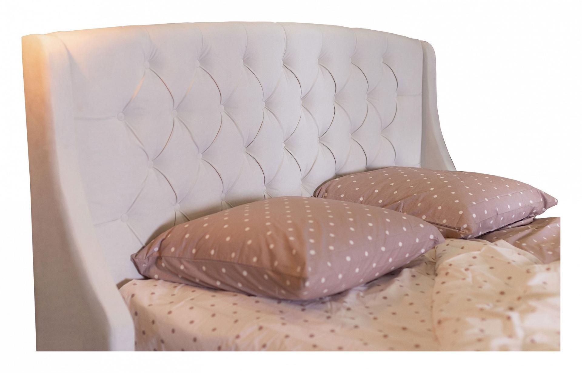 Основной акцент кровати сделан на высоком изголовье с мягкими боковинами – “ушками”. Мягкая спинка изящно оформлены каретной стяжкой с декоративными пуговицами в тон изголовья.