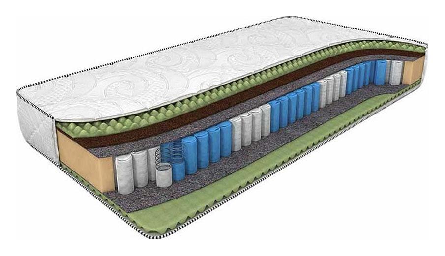 Сторона А - Внешний наполнитель – Ergo Foam – высокоэластичная пена с массажным эффектом и высокой анатомичностью. Внутренний наполнитель – латексированная кокосовая койра, придающая конструкции умеренную жёсткость. Сторона Б - наполнитель – Ergo Foam – высокоэластичная пена с массажным эффектом и высокой анатомичностью. Модель смонтирована на современном высокотехнологичном пружинном блоке Smart Zone, усиливающим массажный эффект и позволяющим выдерживать нагрузку до 140 кг на одно спальное место. Изолирующий слой из термовойлока защищает наполнитель от контакта с металлом пружин, продлевая срок эксплуатации матраса. В комплект входит чехол Трикотаж Антистресс – приятная на ощупь трикотажная ткань успокаивающе действует на психику человека и легко пропускает воздух, позволяя телу свободно дышать.