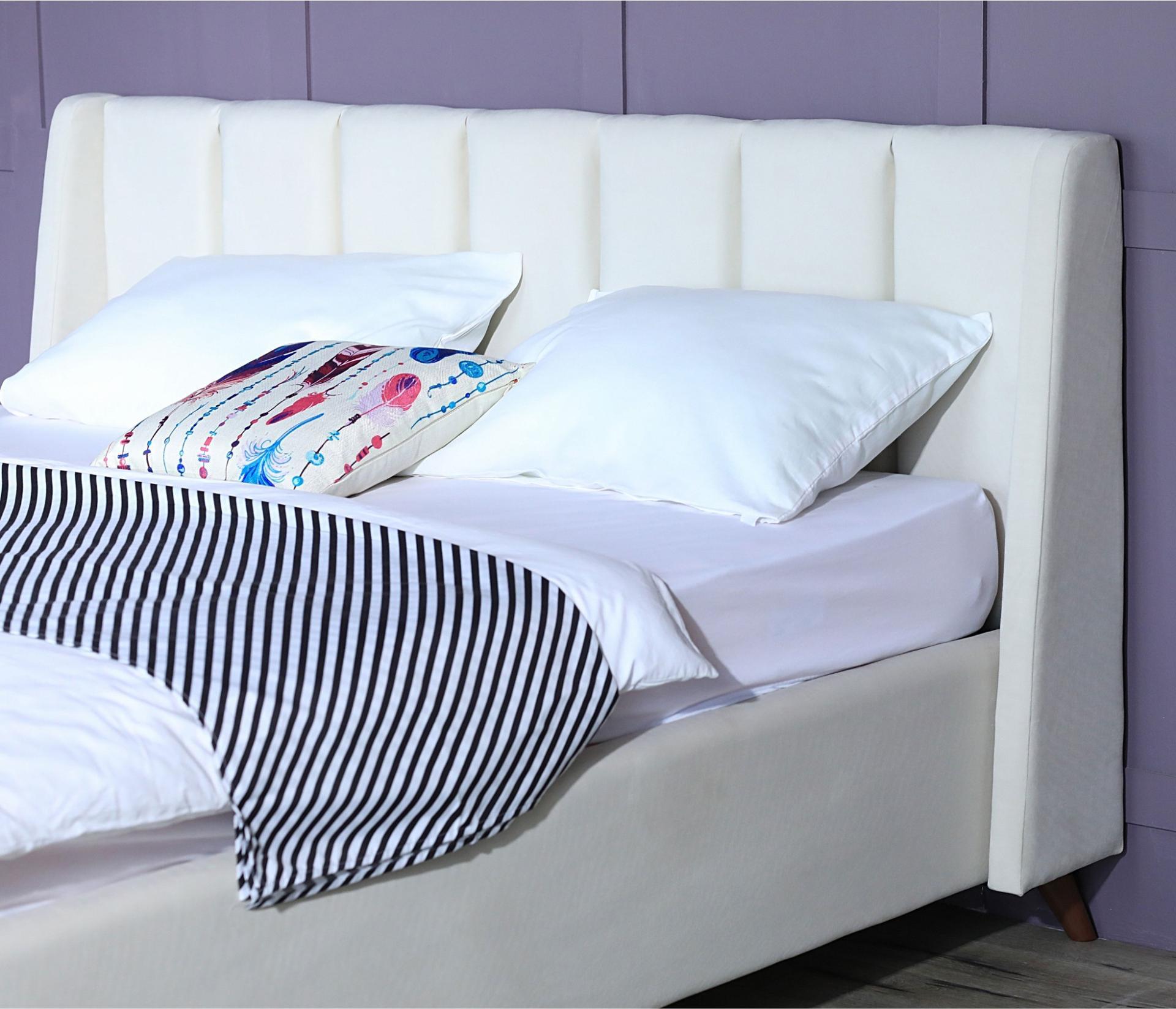Основной акцент сделан на высоком изголовье с декоративной прострочкой и мягкими боковинами – ушками. Мягкие боковины не только придают королевский вид данной двуспальной кровати, но и позволяют использовать ее для отдыха. На пышное изголовье приятно облокотиться за чтением любимой книги или во время просмотра телепередачи.