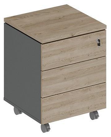 Тумбочка имеет 3 выдвижных ящика, установленных на направляющие TANDEM (BLUM) частичного выдвижения на 75% глубины, имеющие плавный ход и системой открывания Push To Open (без ручек). Динамическая нагрузка 30 кг. Верхний ящик тумбы запирается на замок. Тумба устанавливается на прорезиненные колесные опоры, две из них имеют стопор.