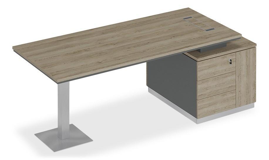 Стол состоит из столешницы, заглушки кабель-канала, металлической опоры и опорной тумбы.