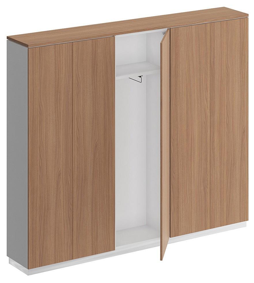 Дизайнерским решением является зазор 8 мм между топом и боковыми стенками корпусом шкафа. Проемы между полками обеспечивают размещение стандартных папок CORONA высотой 320 мм. Шкаф для одежды укомплектован фиксированной по высоте полкой под головные уборы и выдвижной штангой для одежды. Конструктив шкафа для одежды позволяет установить дверь в левом/правом положении. Изделие укомплектовано пятью дверями из ЛДСП без замка с системой открывания Push To Open (без ручек).