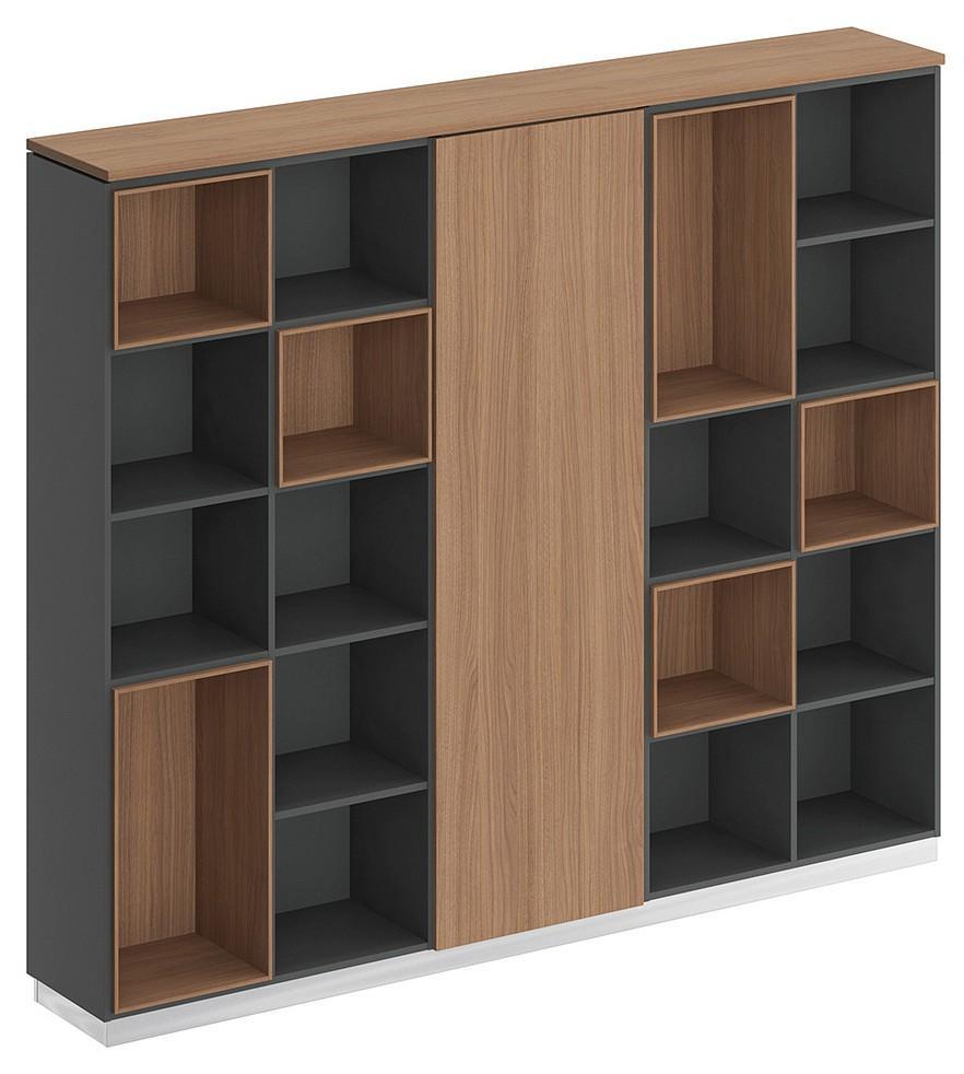 Шкаф комбинированный является стенкой из двух стеллажей и узкого шкафа для одежды под общим топом. Декоративный зазор между топом и боковыми стенками стеллажей является дизайнерским решением.