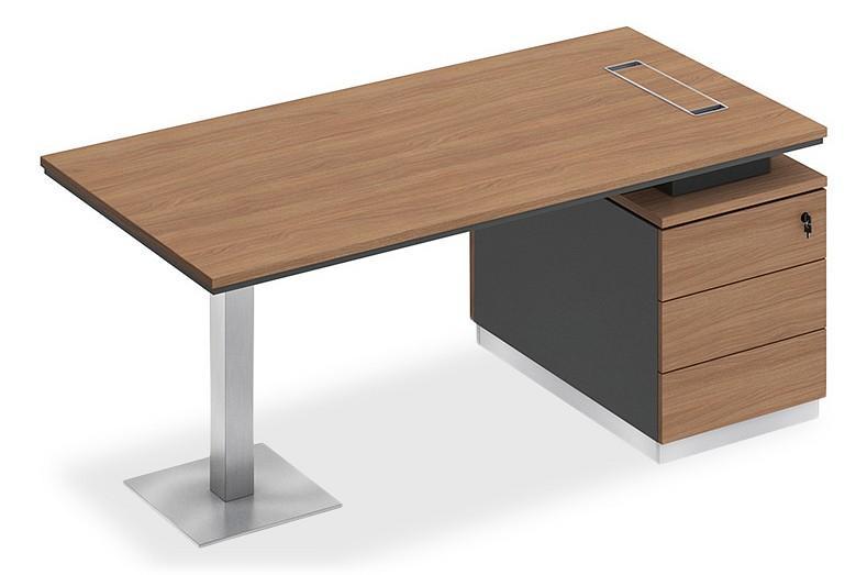 Стол состоит из столешницы, заглушки кабель-канала, металлической опоры и опорной тумбы.