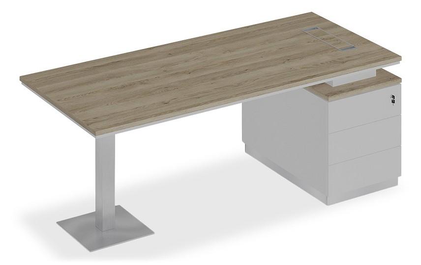 Стол состоит из столешницы, заглушки кабель-канала, металлической опоры и опорной тумбы.