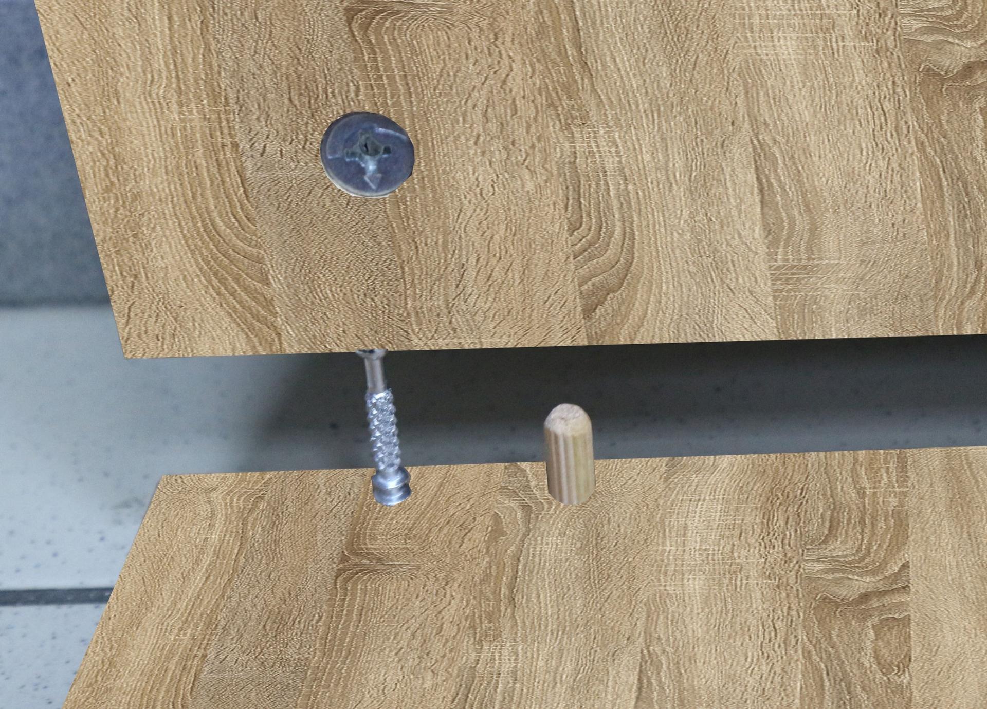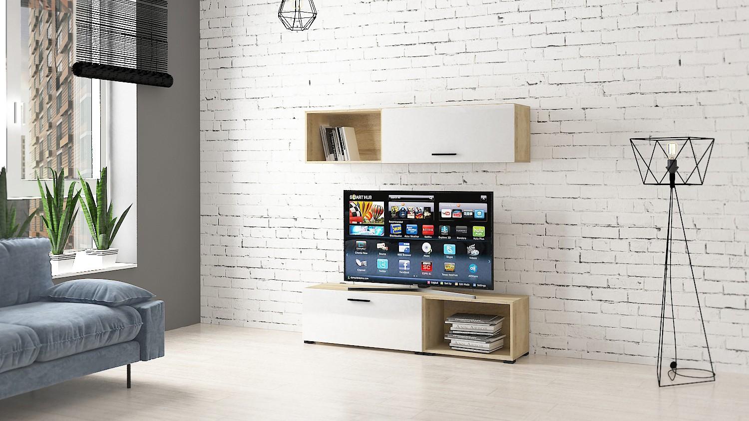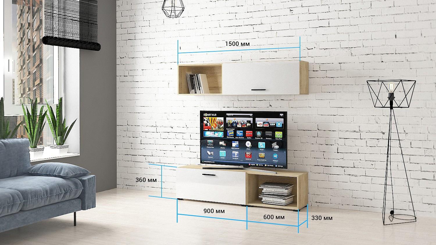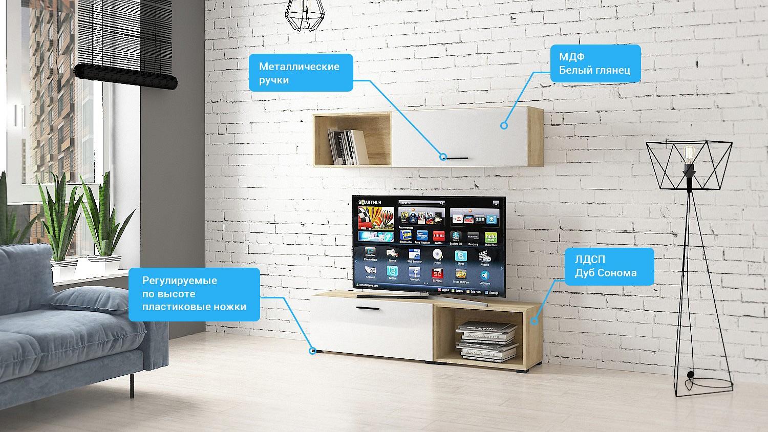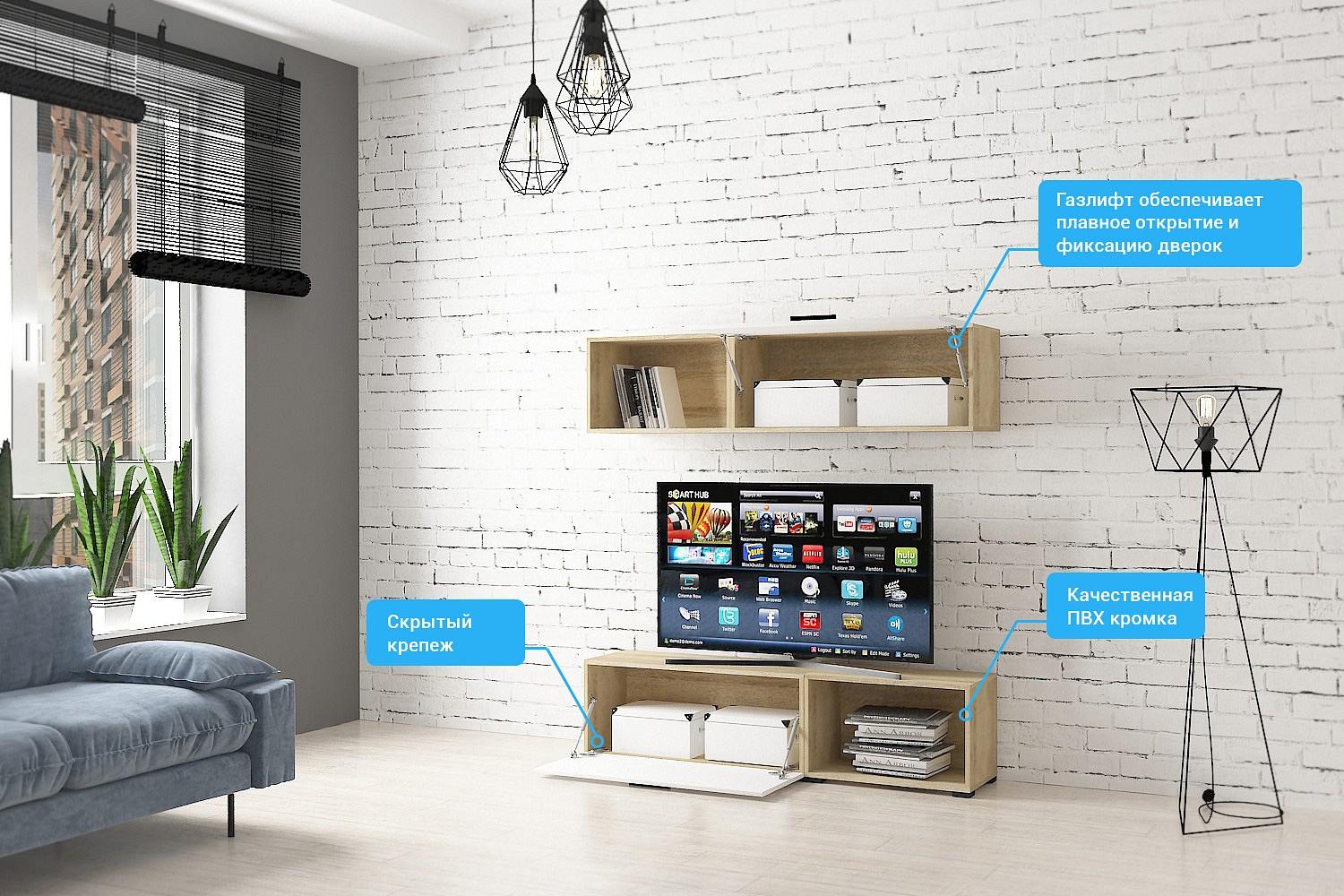 На всех внешних торцах гостиной кромки ПВХ, что обеспечивает безупречный внешний вид и долговечность. Металлические мебельные ручки прочны и надежны, со временем не изменят свой внешний вид.