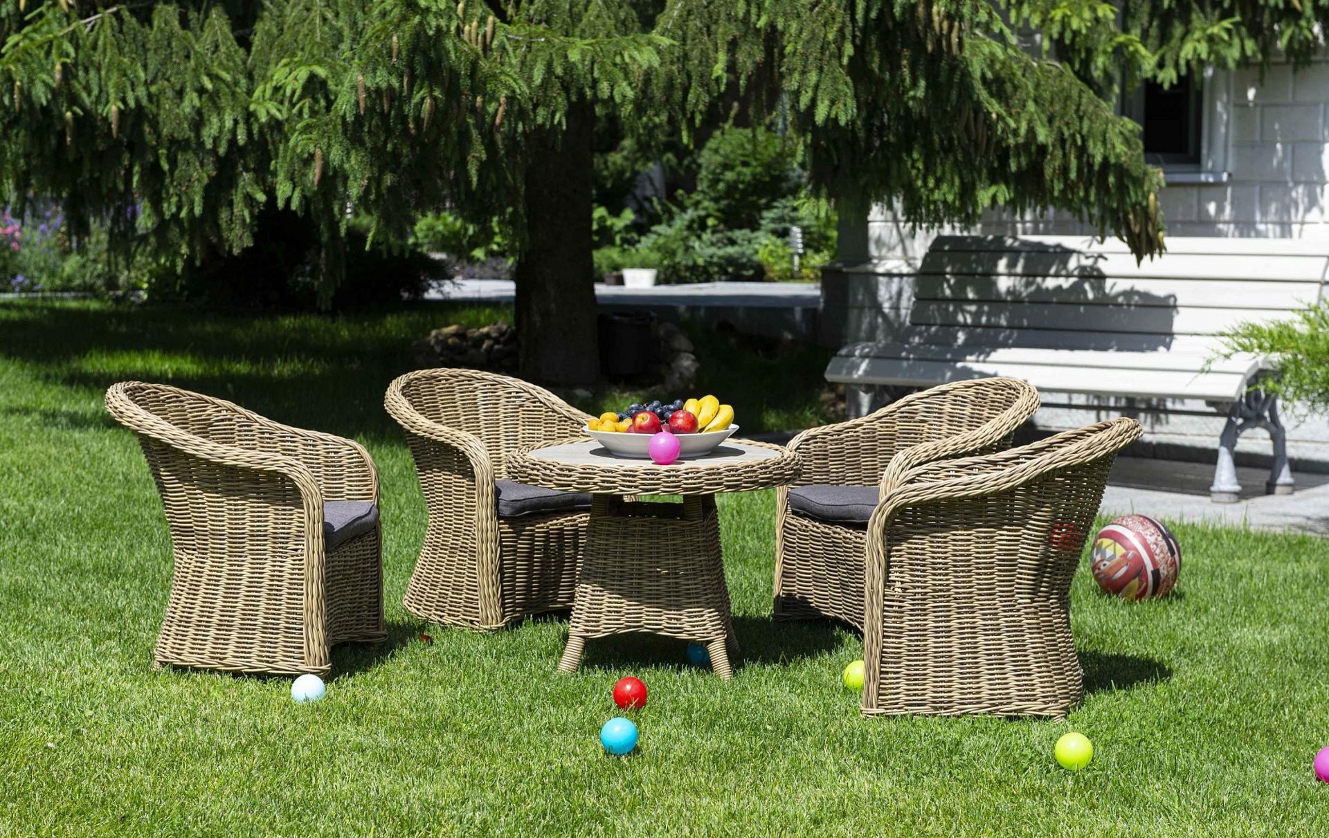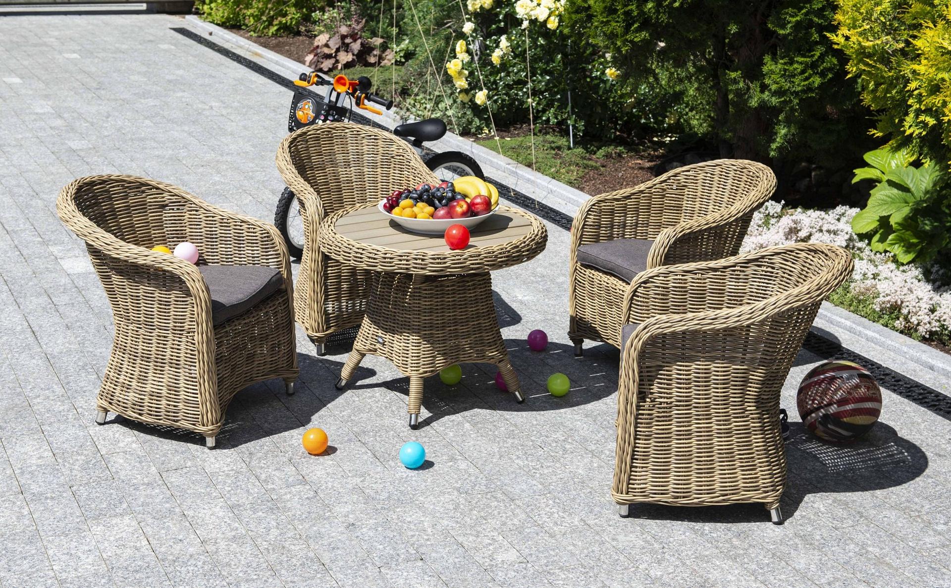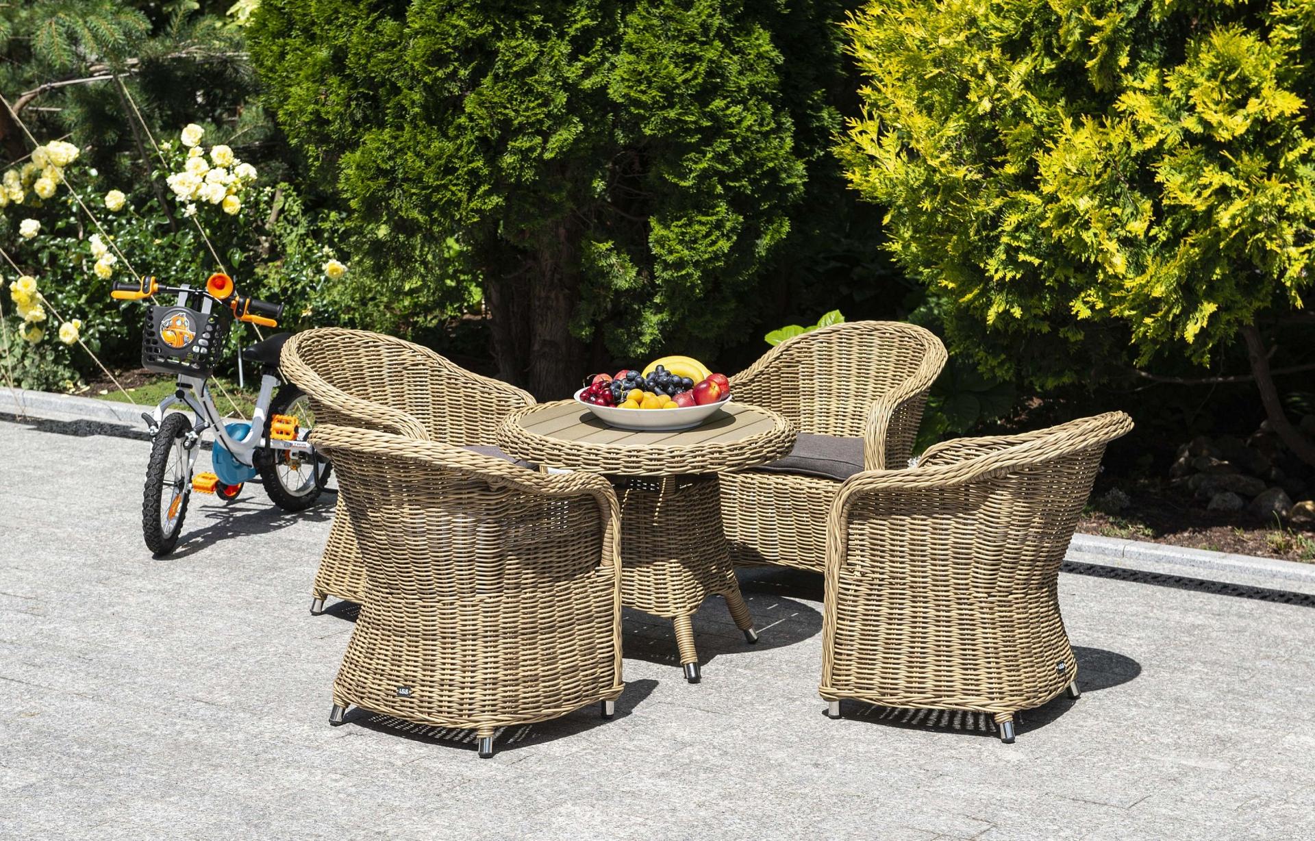 Столик Равенна может использоваться как в роли кофейного, так и в качестве детского обеденного стола, в комплект к которому подходят детские кресла из этой серии. Cтолик располагает прочным каркасом, который изготовлен из качественного алюминия, отвечающий за надежное расположение конструкции. Весь каркас оплетен вручную круглым искусственным ротангом соломенного цвета. Рабочая поверхность столика выполнена из древесно-полимерного композита (ДПК). Материал обладает высокой износостойкостью и прочностью в ходе эксплуатации.