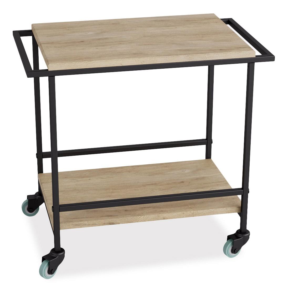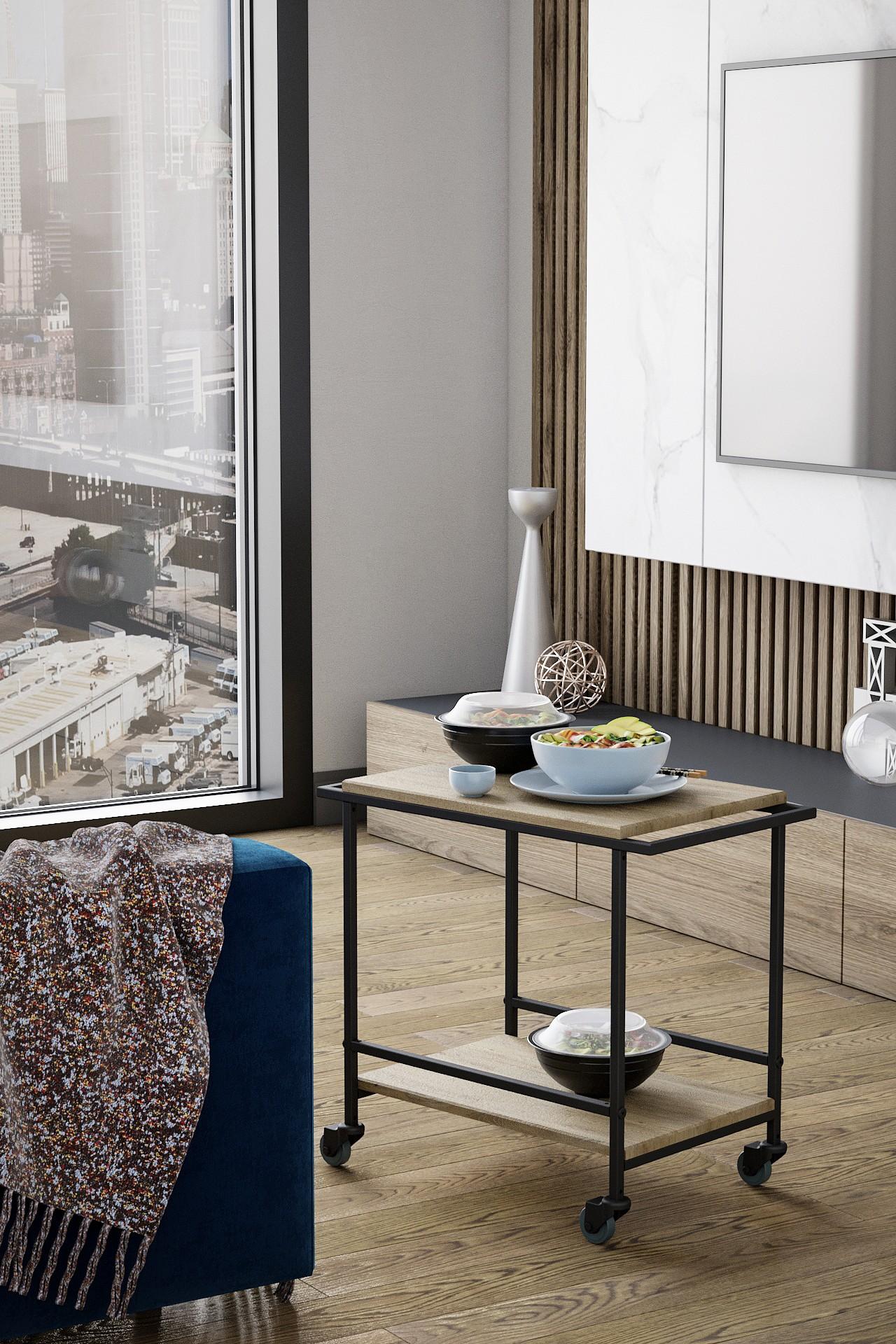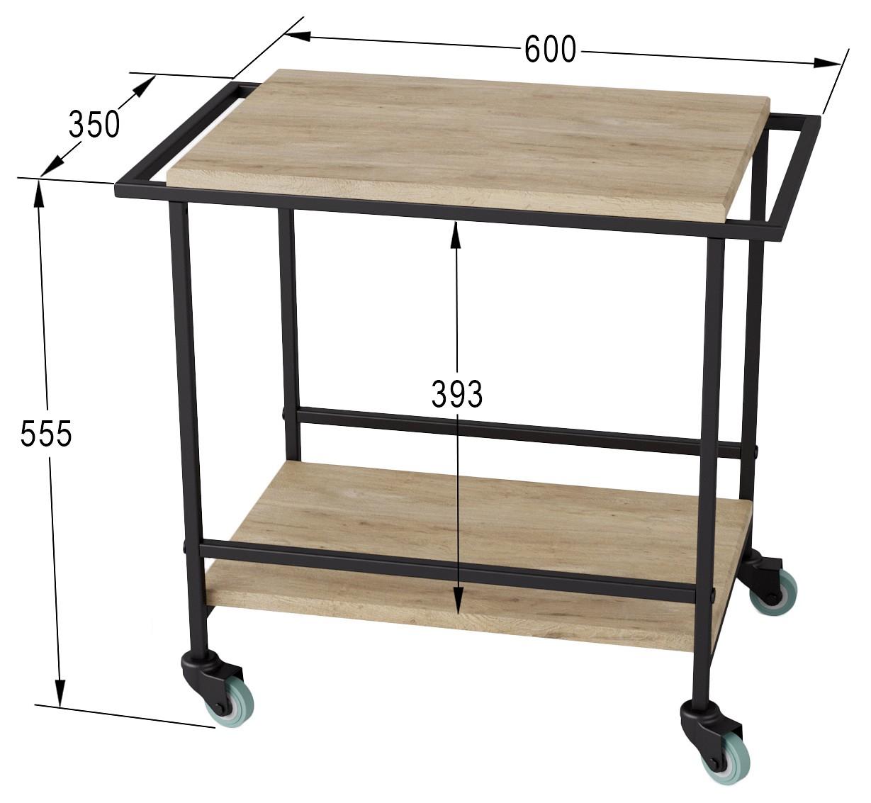 Сервировочный столик Фрэнки - не только стильный, но и практичный предмет интерьера. Он идеально исполнит роль сервировочного столика: поможет быстро и легко доставить все необходимое из кухни в гостиную. Для этого он дополнен удобными ручками и прочными поворотными колесами. Каркас столика выполнен из профильной трубы, столешница и полка - из прочного и влагостойкого материала МДФ, облицованного декоративным покрытием в современном цветовом решении.