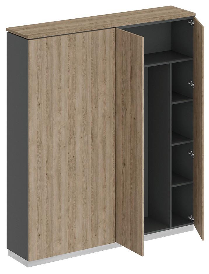 Шкаф состоит из закрытого шкафа для документов и шкафа для одежды с дополнением под общим топом под общим топом и цоколя на 2 шкафа.