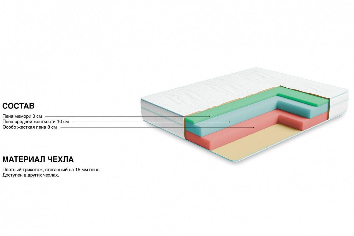 Основу матраса составляют 3 вида премиальной пены. Верхний слой - пена с памятью формы, которая создает воздушность и комфорт, точно повторяя и запоминая, каждый изгиб тела. Средний слой- слой пены, которая обладает исключительной упругостью, этот слой принимает на себя основную нагрузку и распределяет ее по всей поверхности, оказывая обратное давление лишь там где это необходимо. Нижний слой сделан из особожесткой и прочной пены, которая и позволяет матрасу выдерживать очень высокие нагрузки на спальное место (до 150 кг). Чехол матраса выполнен из особо мягкого трикотажа высокой плотности, итальнского производства, ткань чехла не впитывает запахи и легко отмывается.Бурлет (бок) матраса выполнен из мебельной ткани, которая придает ему законченный вид и увеличивает срок его службы. Чехол стегается на 15 мм пене.