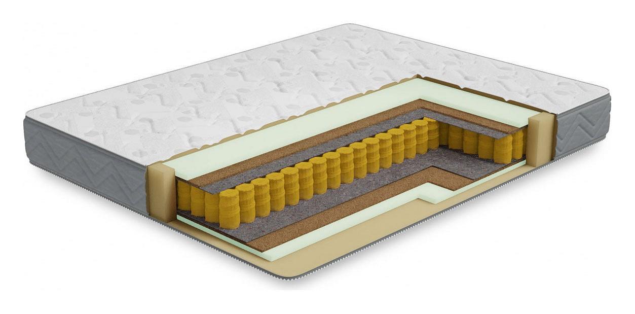 С обеих сторон матраса в качестве комфортного слоя используется 2 см искусственного латекса, этот матераил очень долговечный и упругий, благодаря этому слою на этом матрасе будет одинаково комфортно людям разных весовых категорий. Для распределения нагрузки и придания необходимой жесткости используется латексированный кокосовый лист, который кладется под латекс. В основе матраса лежит блок независимых пружин, благодаря которому матрас будет индивидуально подстраиваться под каждого спящиего и оказывать обратное давление только там, где это действительно необходимо. Чехол матраса сделан из плотного мягкого трикотажа, который стегается на 15 мм пене и синтепоне, что добавляет не много мягкости.