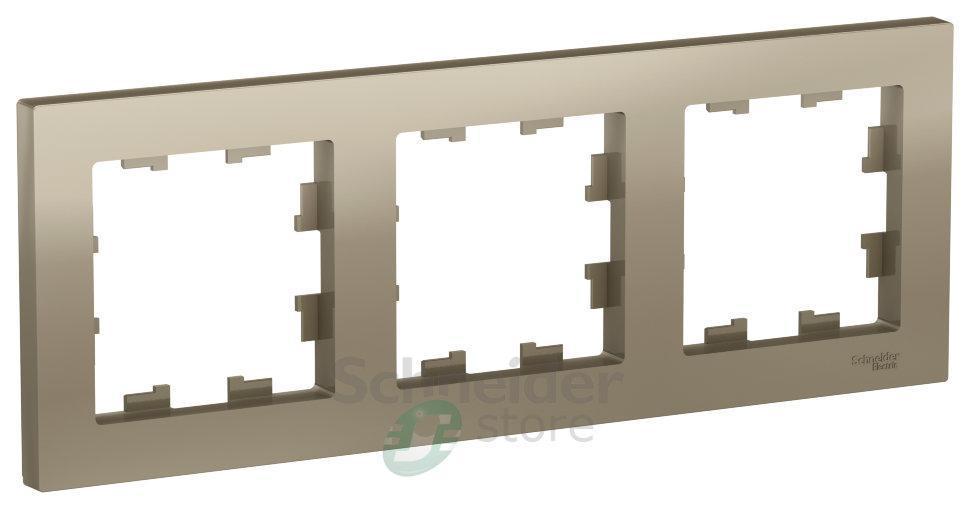 Рамка Schneider Electric AtlasDesign (цвет шампань) трёхместная. - Устанавливается в вертикальном и горизонтальном положениях. - Лицевые детали из качественного ABS-пластика, устойчивого к царапинам и УФ-излучению. - Позволяет гармонично вписать электроустановочное изделие в интерьер помещения.