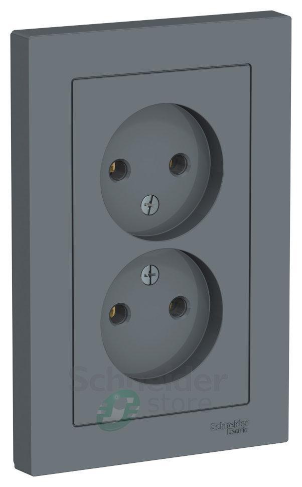 Розетка двойная Schneider Electric AtlasDesign (в сборе, цвет грифель) без заземления и без шторок подходит для сетей 250 В, на ток 16 А.