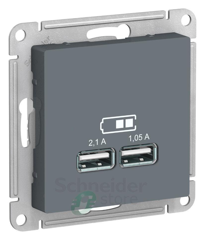 Механизм Schneider Electric AtlasDesign (цвет грифель) розетки для зарядки с двумя разъёмами USB с выходными напряжением 5 В постоянного тока и выходами с номинальным током по 2,1 А.