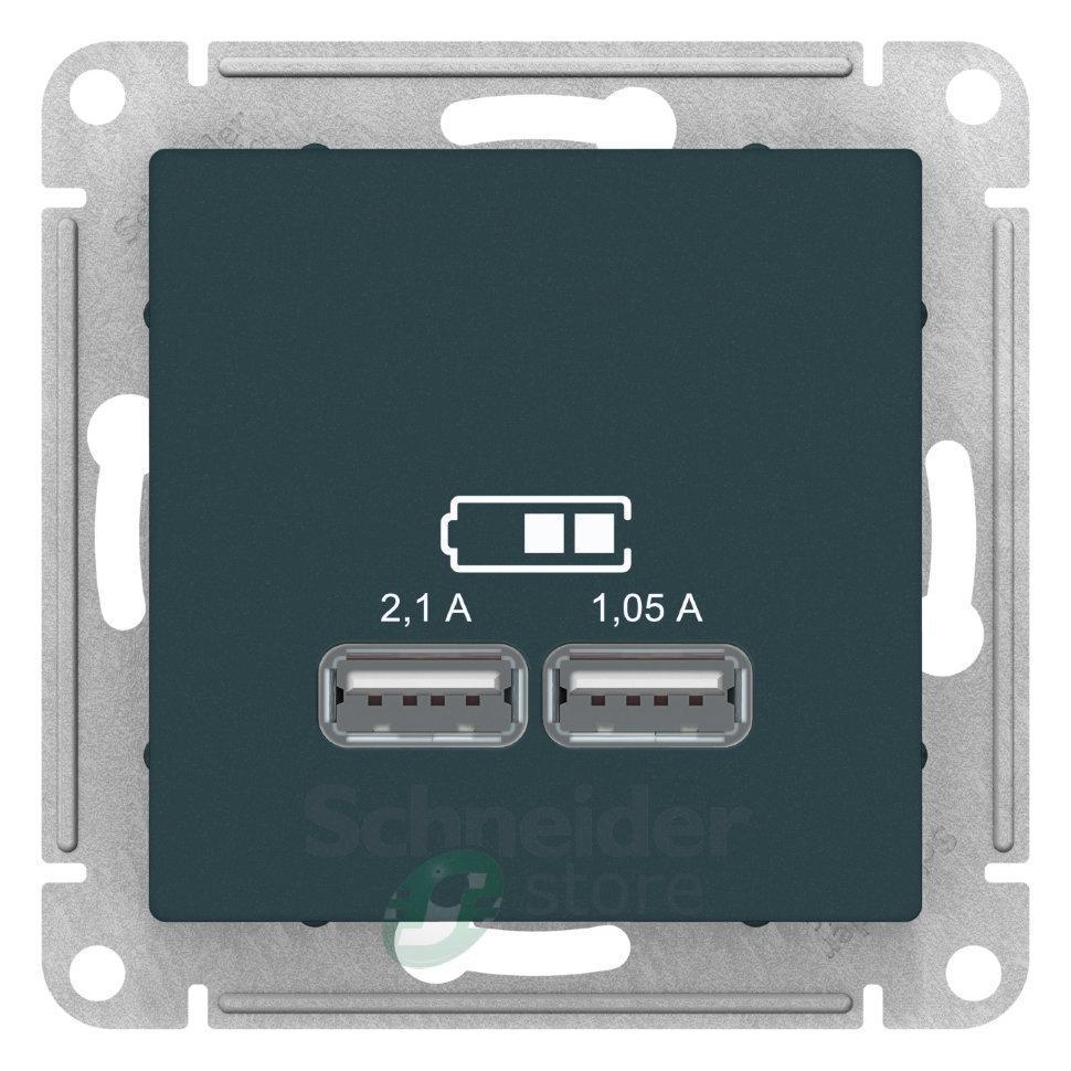 Механизм Schneider Electric AtlasDesign (цвет изумруд) розетки для зарядки с двумя разъёмами USB с выходными напряжением 5 В постоянного тока и выходами с номинальным током по 2,1 А.
