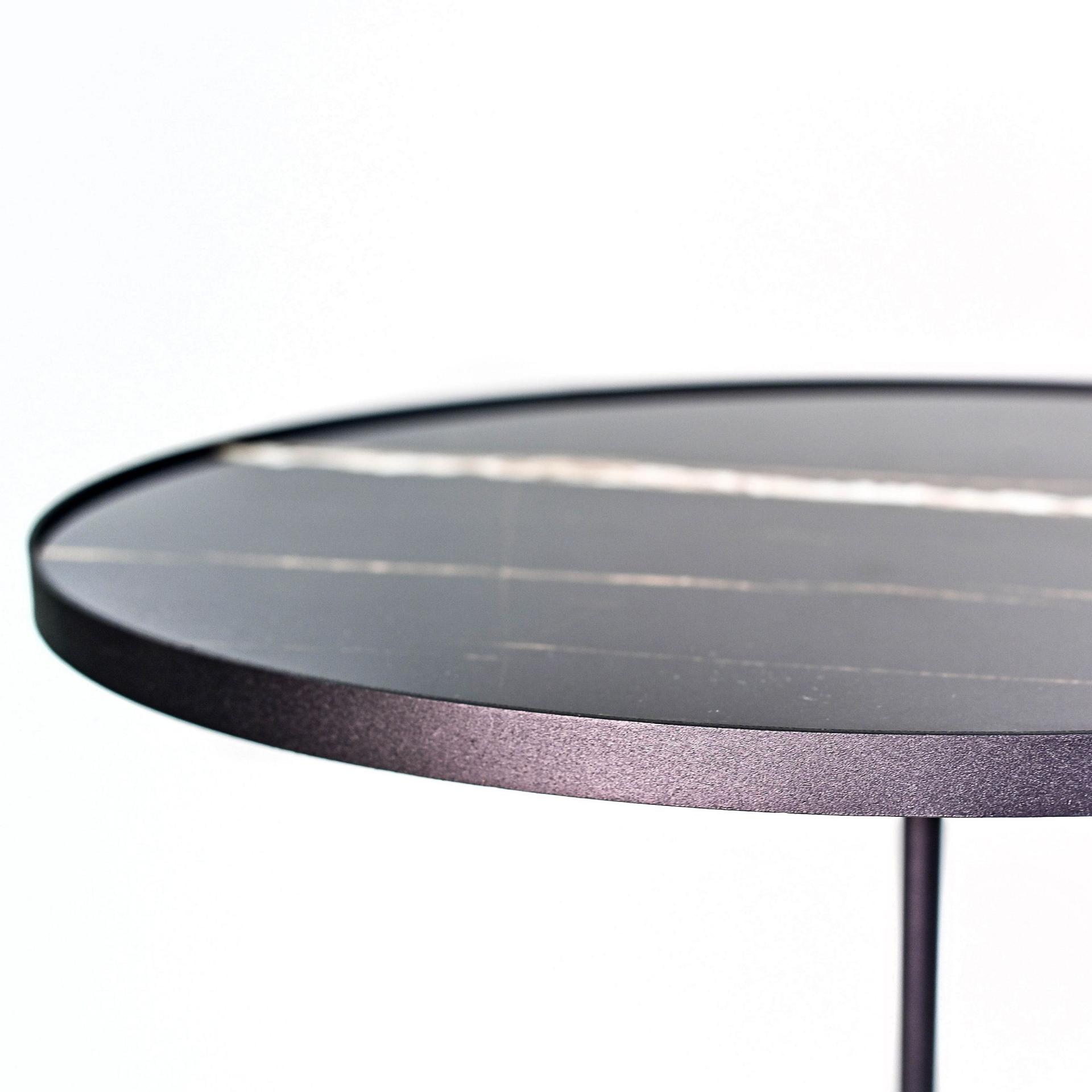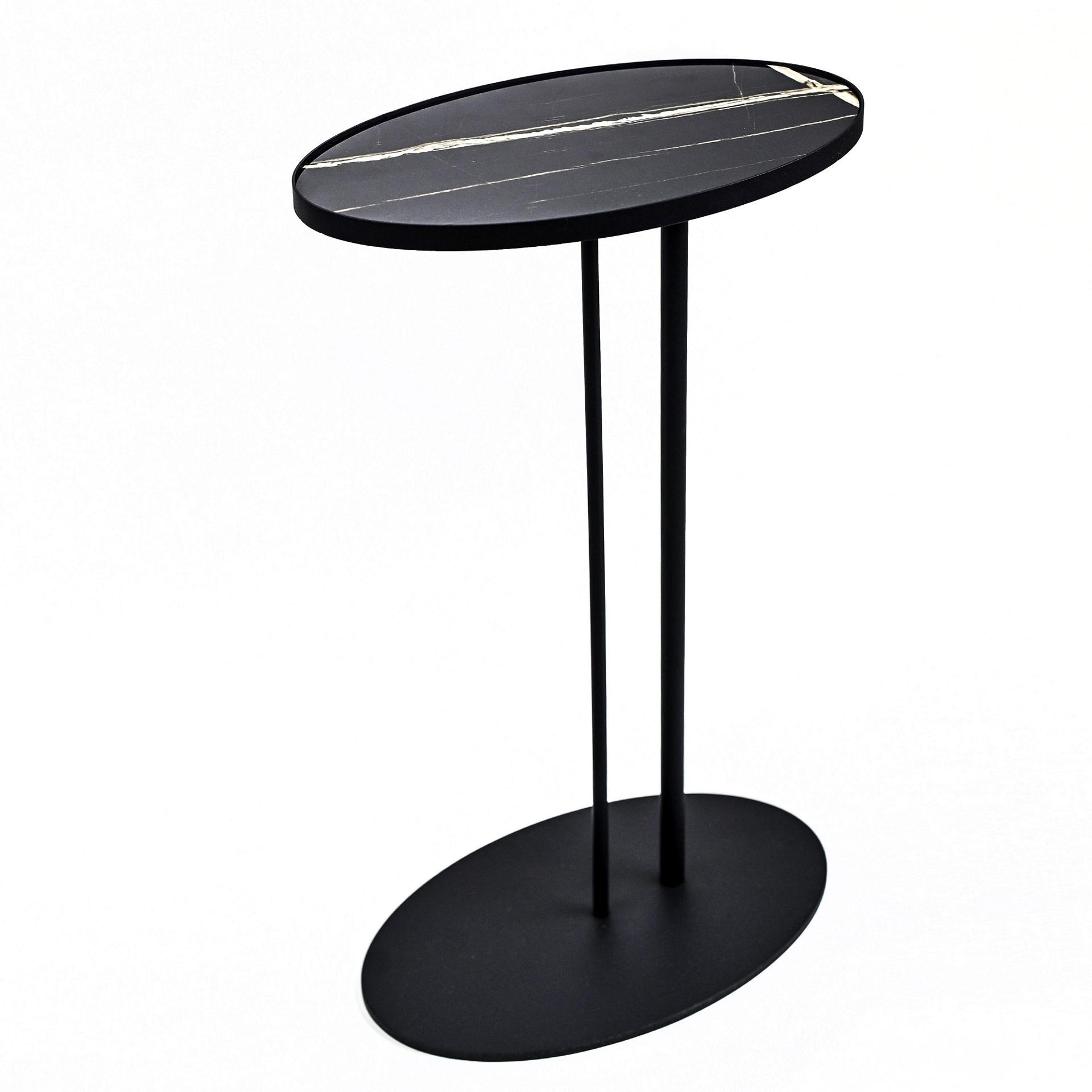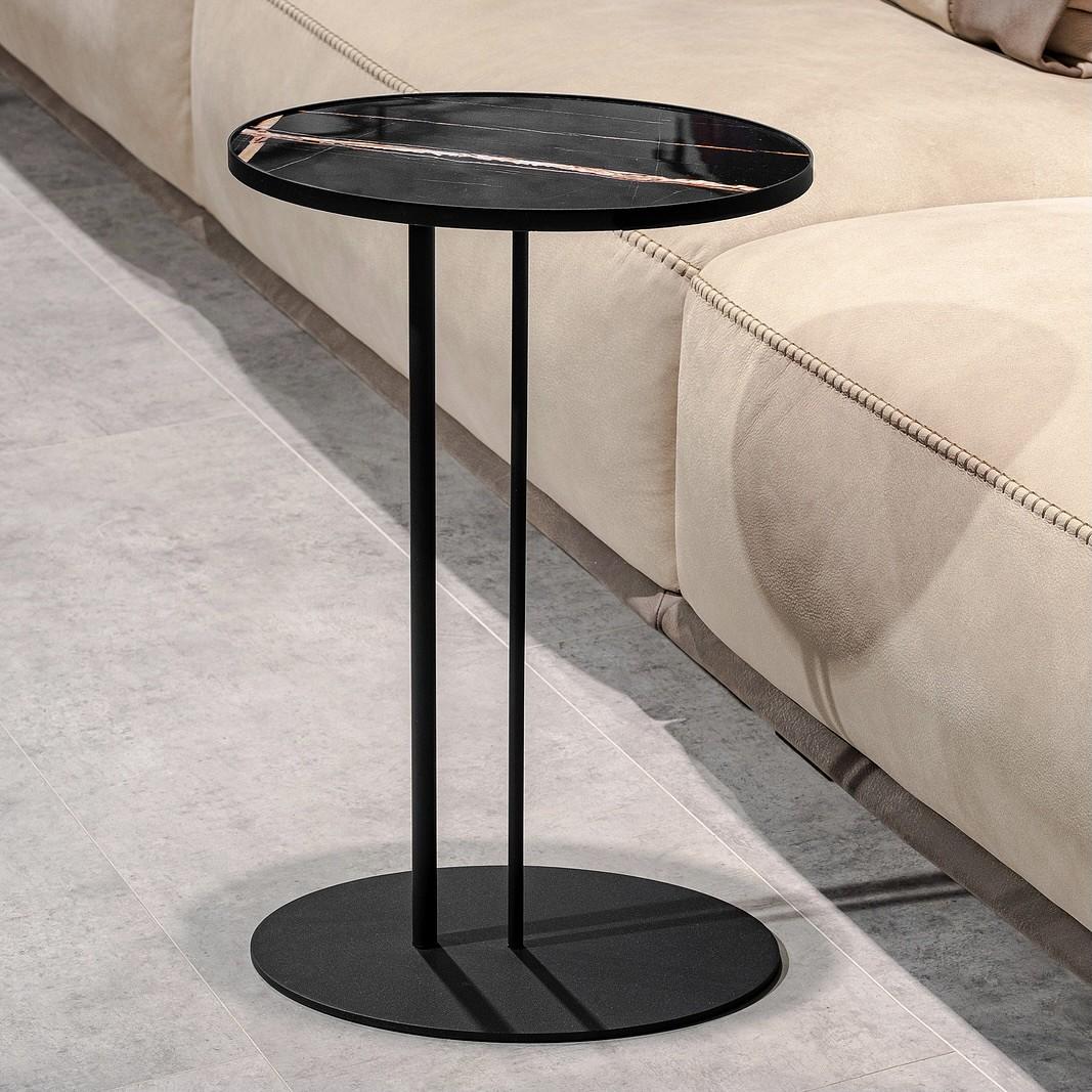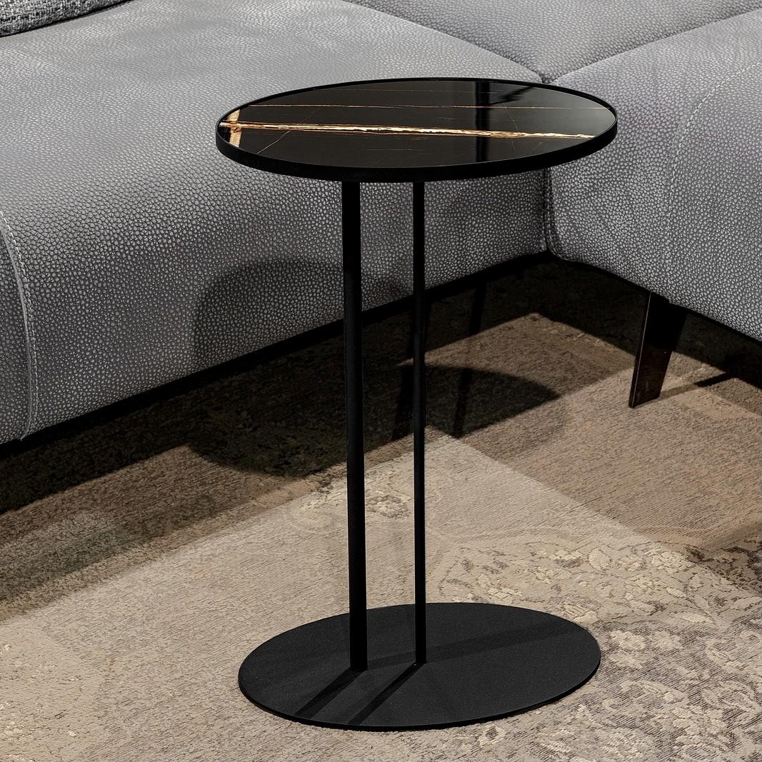 Прекрасно подойдет в качестве прикроватного столика для хранения мелочей. Опора стола изготовлена из металла, окрашенного краской, столешница из керамогранита, имитирующего мрамор.
