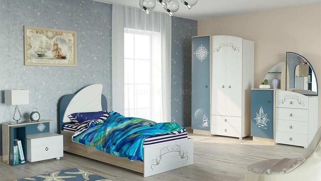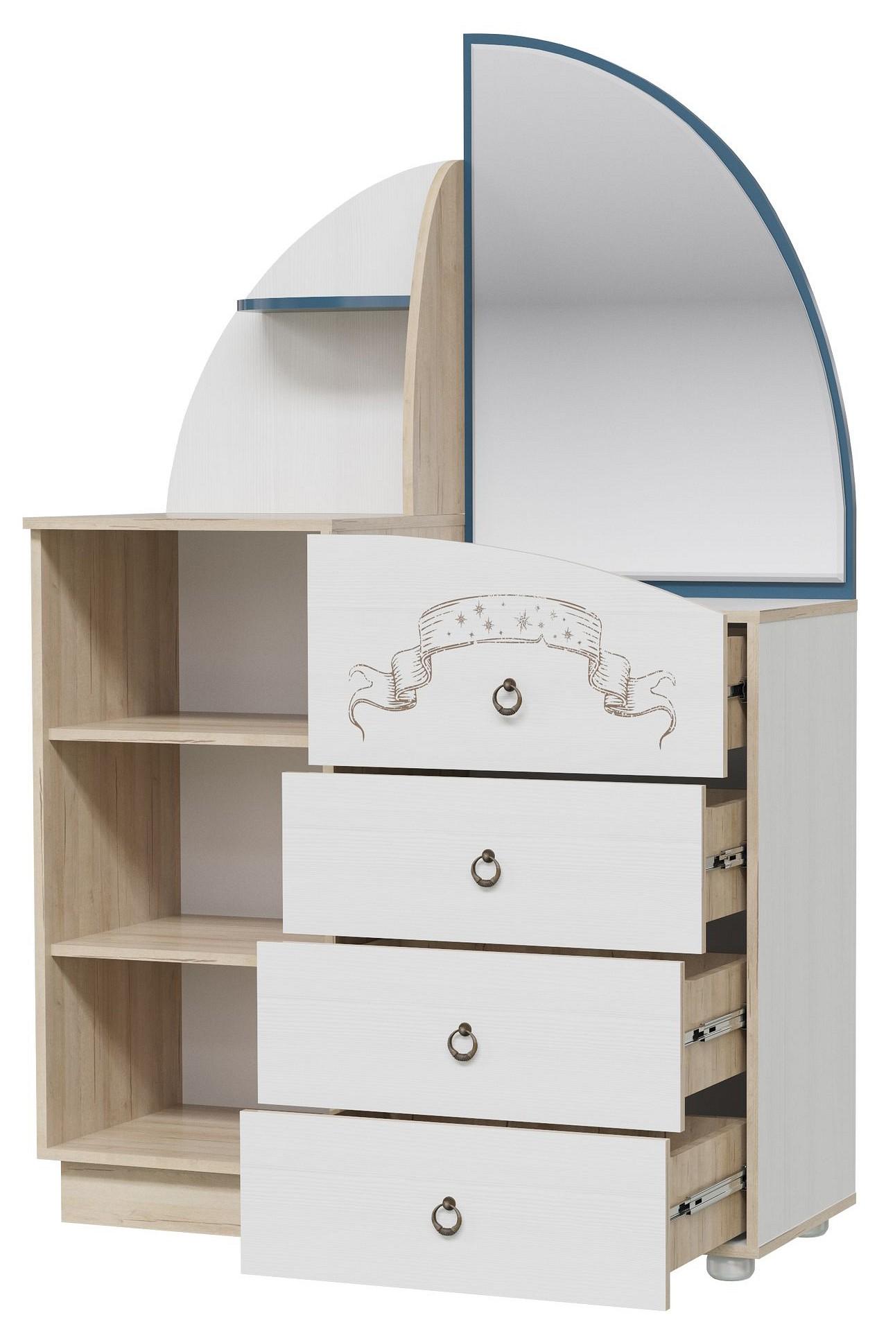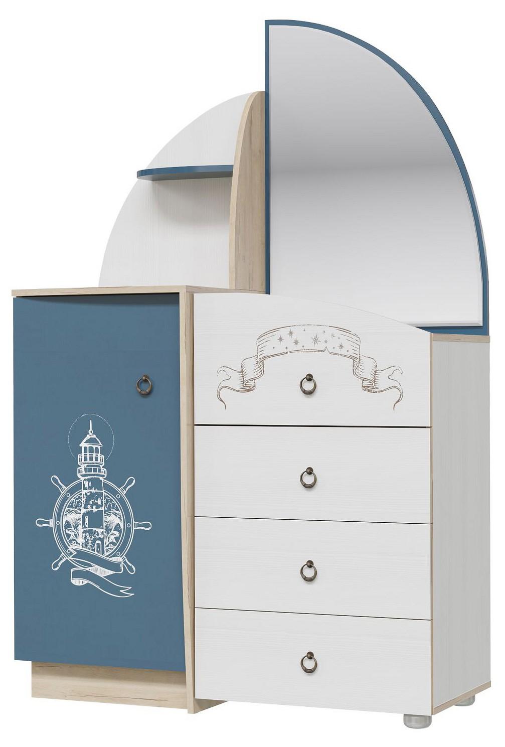 Комод Бриз с зеркалом дополнит интерьер детской или молодежной комнаты. Конструкция с закрытой секцией с дверкой и четырьмя выдвижными ящиками для хранения.