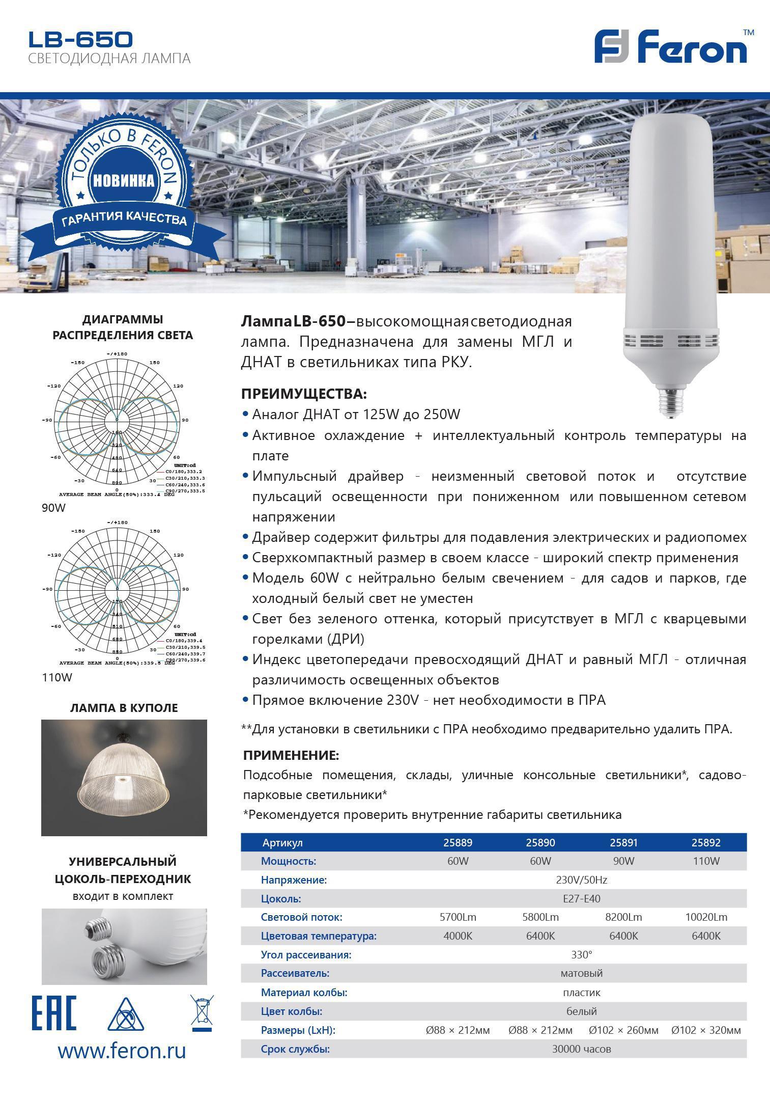 Лампа светодиодная Feron LB-650 E27-E40 60W 4000K