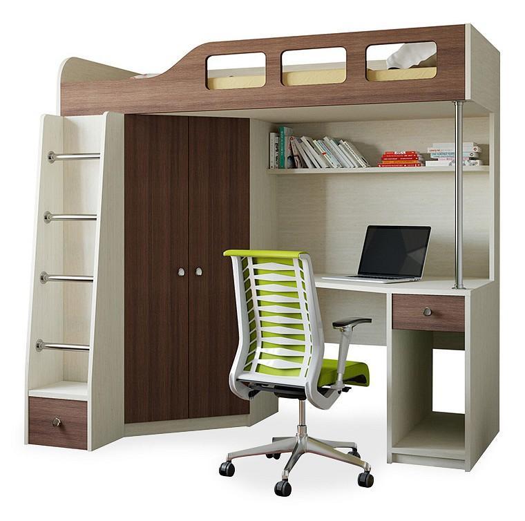 Детская кровать, как и положено, снабжена бортиками безопасности. В под кроватном пространстве большой вместительный шкаф, расположенный в углу и имеющий две створки. С боку шкафа прикреплена удобная лестница со ступенями из металлической штанги. С одной стороны оборудован рабочий стол с полкой для учебников и книг.