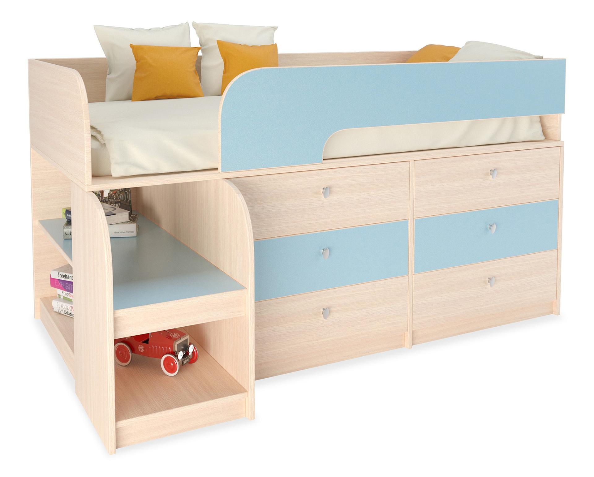 Ваш ребенок подрос и наступила пора обновить мебель в детской? Набор для детской Астра 9/3 RVM_ASTRA9-V3-1-6 – отличное решение, которое придется по вкусу не только вам, но и будущему маленькому хозяину или хозяйке. Изделие выпущено популярным брендом РВ-Мебель (Россия) и входит в коллекцию «Астра 9/3». Благородный матовый корпус оттенка голубой, дуб молочный смотрится изысканно и изящно, гармонично дополняя фасад, изготовленный из практичного и оптимального для детской материала (ЛДСП Е1). Перед приобретением новой кровати не забудьте тщательно замерить свободную площадь в комнате, чтобы кровать оптимально подошла по размерам (900 мм в высоту, 1632 мм в ширину и (уточните актуальную информацию у нашего консультанта) мм в длину), а также подобрать матрас 1600x800 мм. В комплект входит основание настил из ЛДСП,