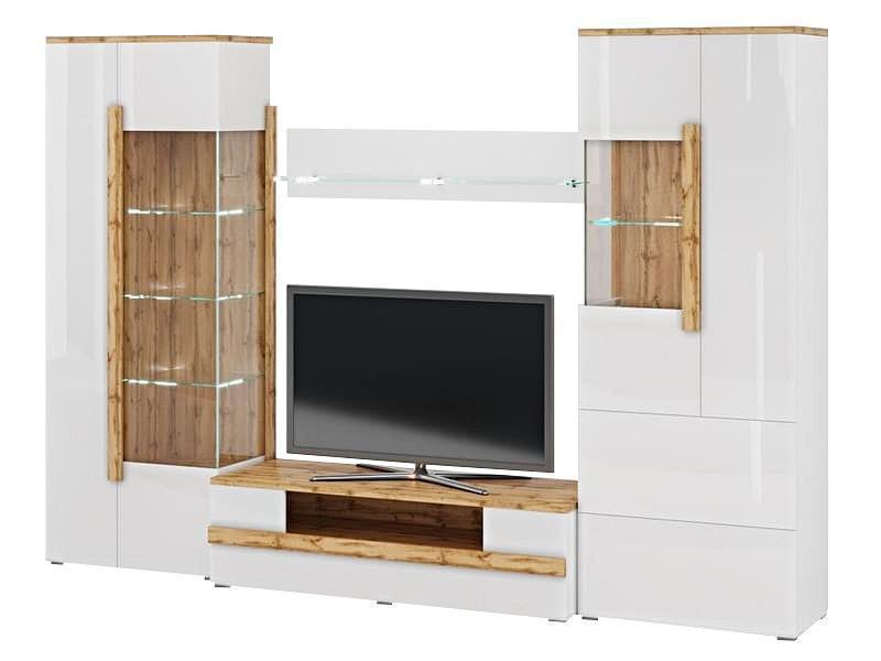 Одним из основных элементов каждой гостиной в большинстве случаев становится мебель, к выбору которой стоит относиться с особой тщательностью. Прекрасным вариантом как для крупногабаритных, так и для небольших помещений может стать композиция 13 Сахара. Ее комплектация подобрана с учетом современных требований к красоте, практичности и функциональности. В состав ансамбля дизайнеры включили двухдверный шкаф-витрину, витрину с выдвижными ящиками, оснащенными современными механизмами push to open, а также элегантную тумбу под ТВ и навесную полку.
