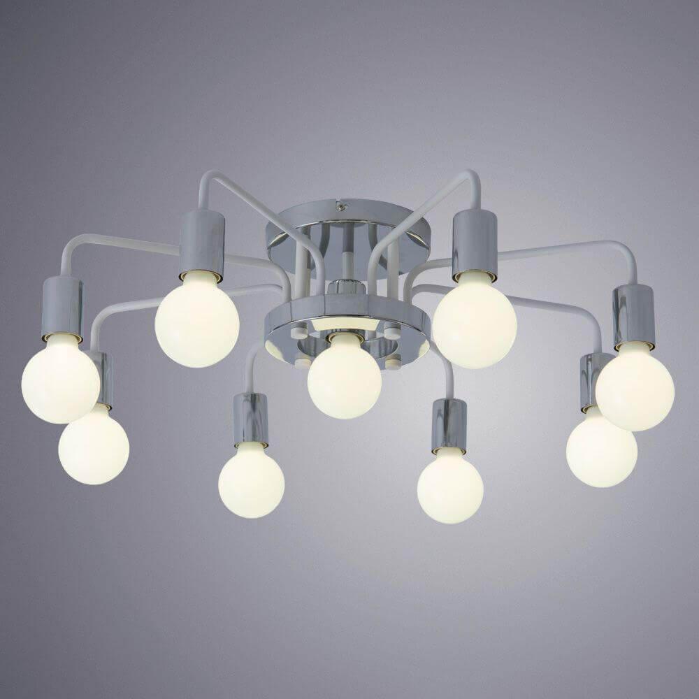 Неподражаемая модель A6001PL-9WH от итальянской компании Arte Lamp относится к коллекции 6001 и отлично подойдет для установки на низкий потолок в гостиной, оформленной в современном стиле. Потолочная люстра Arte Lamp A6001PL-9WH без плафонов осветит помещение площадью 24 кв. м. Производитель Arte Lamp рекомендует использовать для устройства лампы накаливания с цоколем E27 и мощностью 40 W. Прибор произведен с использованием материала: металл и может использоваться для натяжного потолка. Основным цветом товара является хромовый и белый. Торопитесь сделать заказ в интернет-магазине SvetONe.