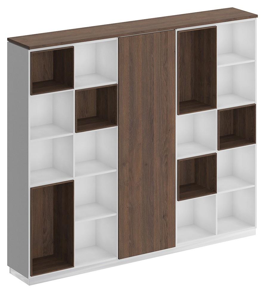 Шкаф комбинированный является стенкой из двух стеллажей и узкого шкафа для одежды под общим топом. Декоративный зазор между топом и боковыми стенками стеллажей является дизайнерским решением.