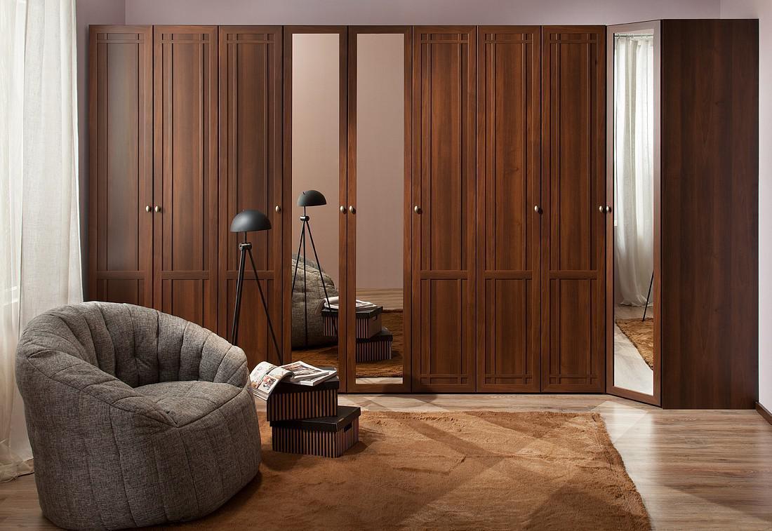 Фасады двух центральных дверей декорированы зеркалами, что, очень удобно, а также зрительно увеличивает пространство комнаты. Две боковых двери облицованы деревянной раскладкой.
