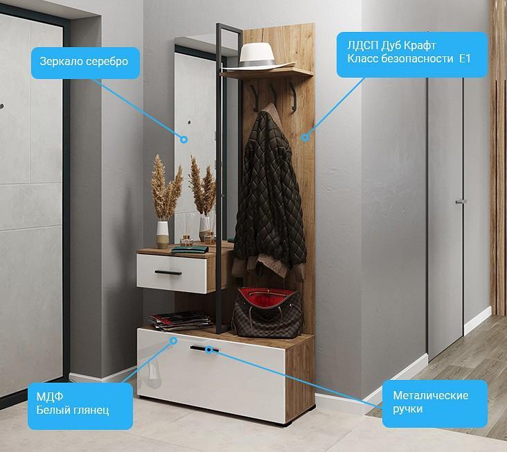 На всех внешних торцах прихожей кромки ПВХ, что обеспечивает безупречный внешний вид и долговечность. Металлические мебельные ручки, крючки для одежды и декоративная рамка прочны и надежны, со временем не изменят свой внешний вид.