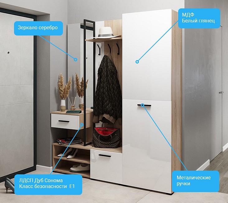 Прихожая сделана из ЛДСП класса Е1 ведущего европейского производителя, фасады из экологичного МДФ, покрыты ПВХ глянцевой пленкой.