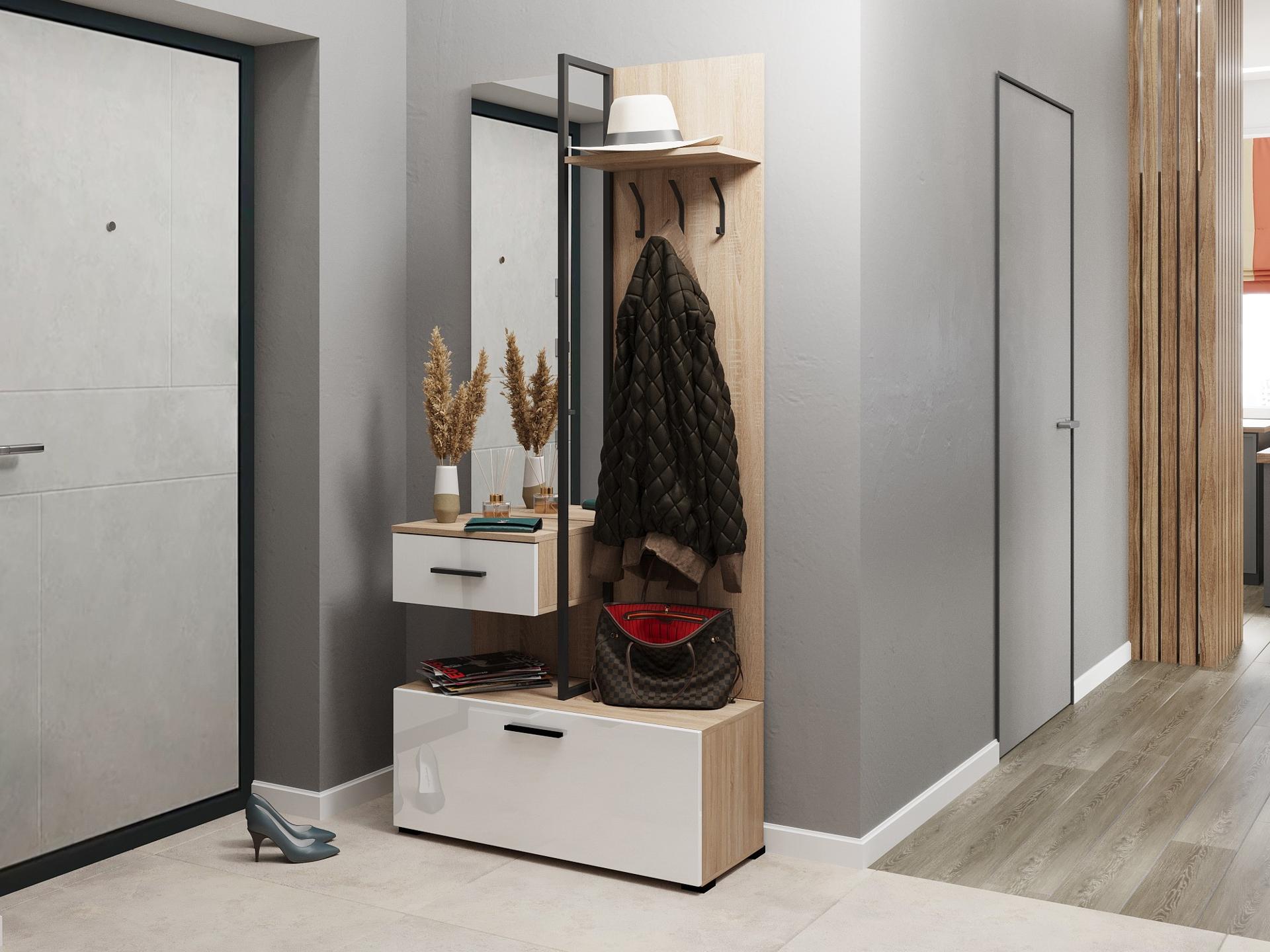На всех внешних торцах прихожей кромки ПВХ, что обеспечивает безупречный внешний вид и долговечность. Металлические мебельные ручки, крючки для одежды и декоративная рамка прочны и надежны, со временем не изменят свой внешний вид.