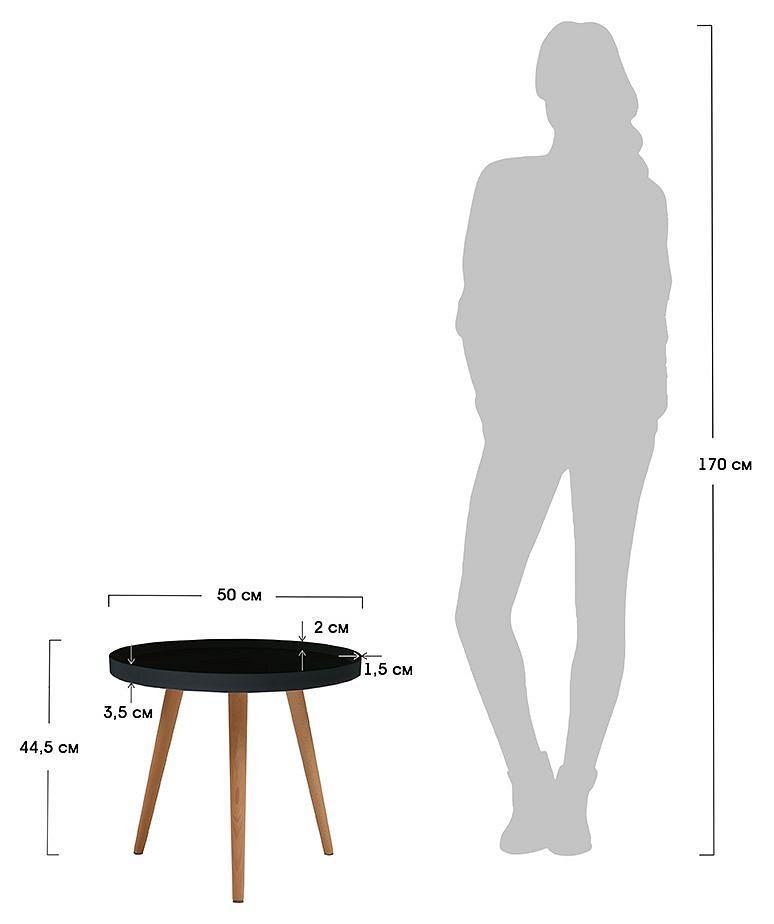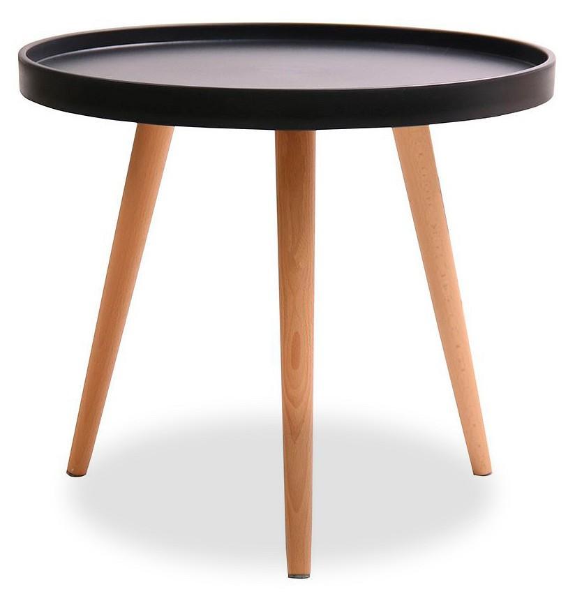 Небольшой круглый журнальный столик Aurora в черном цвете. Диаметр столешницы - 50 см, материал – полипропилен. По краю стола сделан аккуратный бортик, за счет чего можно не бояться что-то пролить. Ножки из натурального бука обеспечивают устойчивость и легкость.
