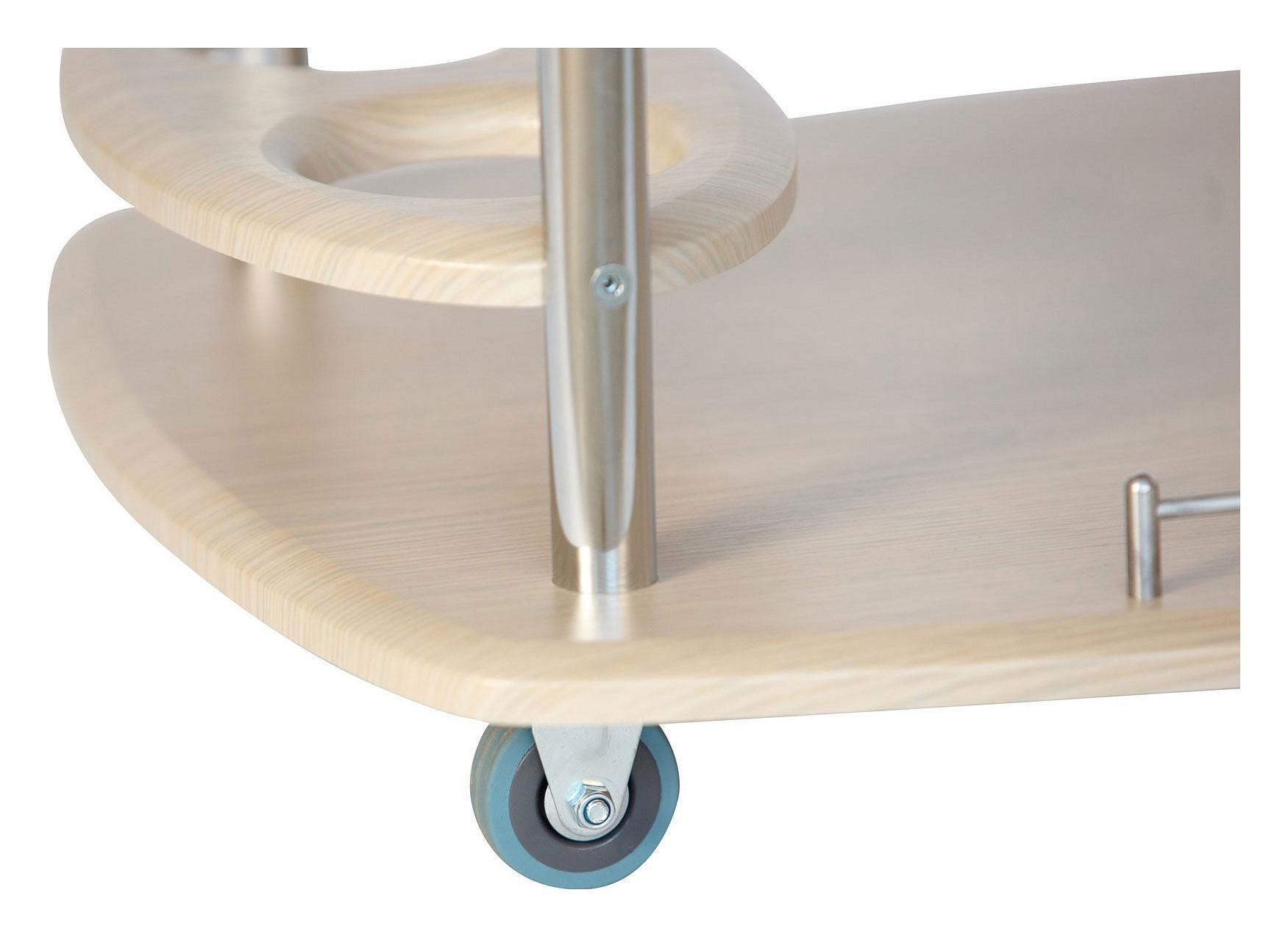 Столик оснащен держателями для бутылок, удобной ручкой и колесами для плавного, бесшумного и легкого перемещения.