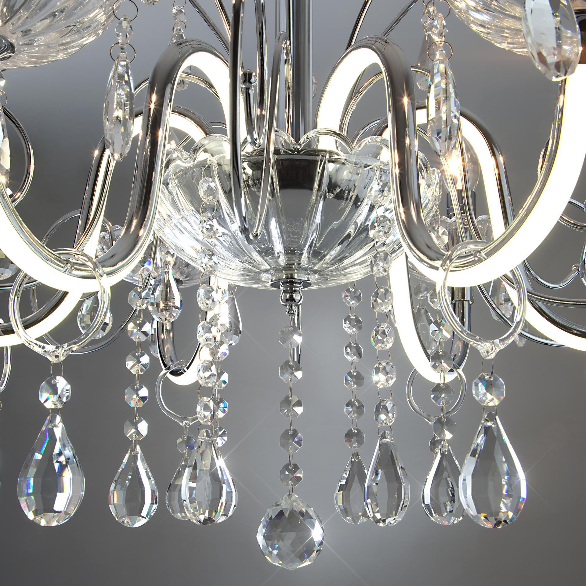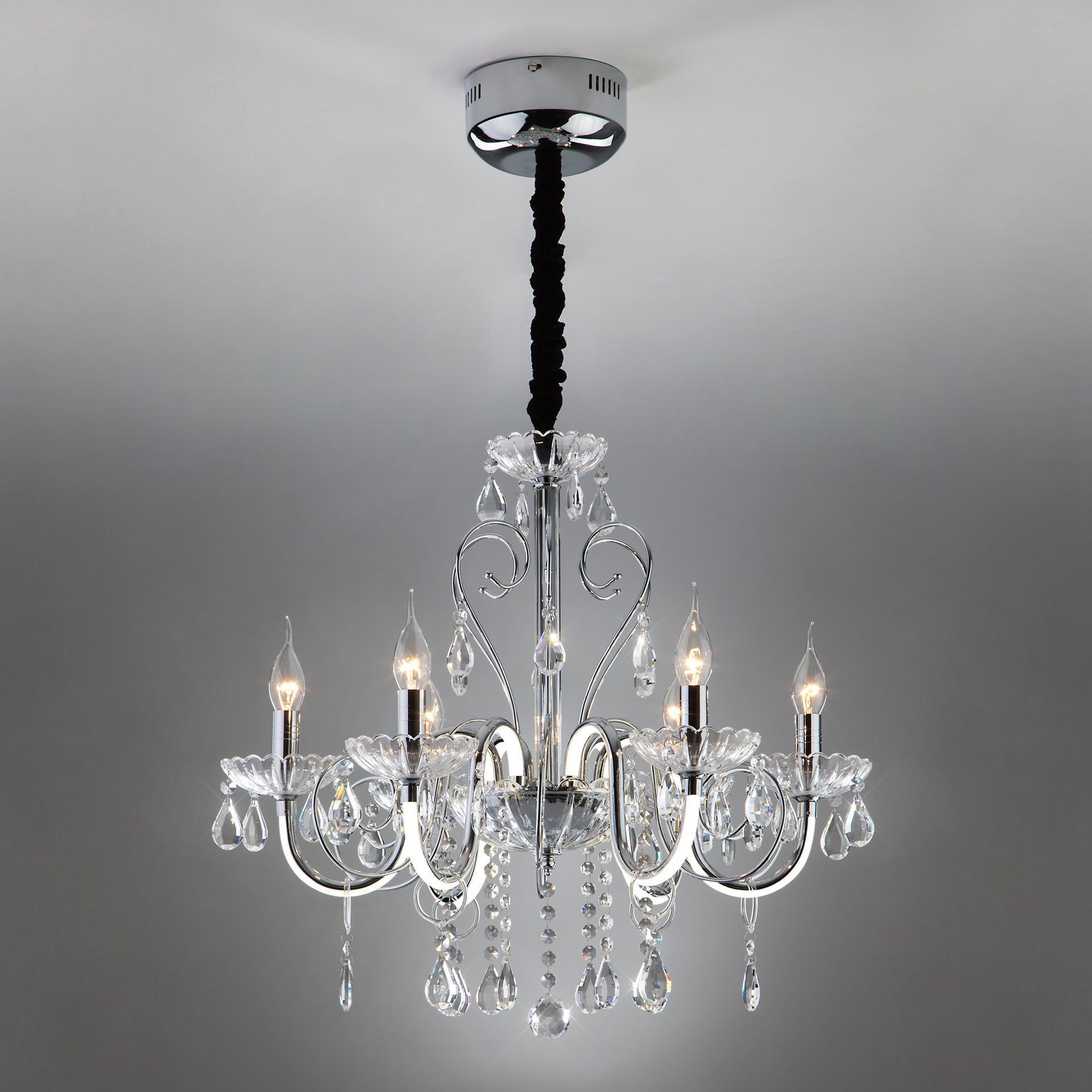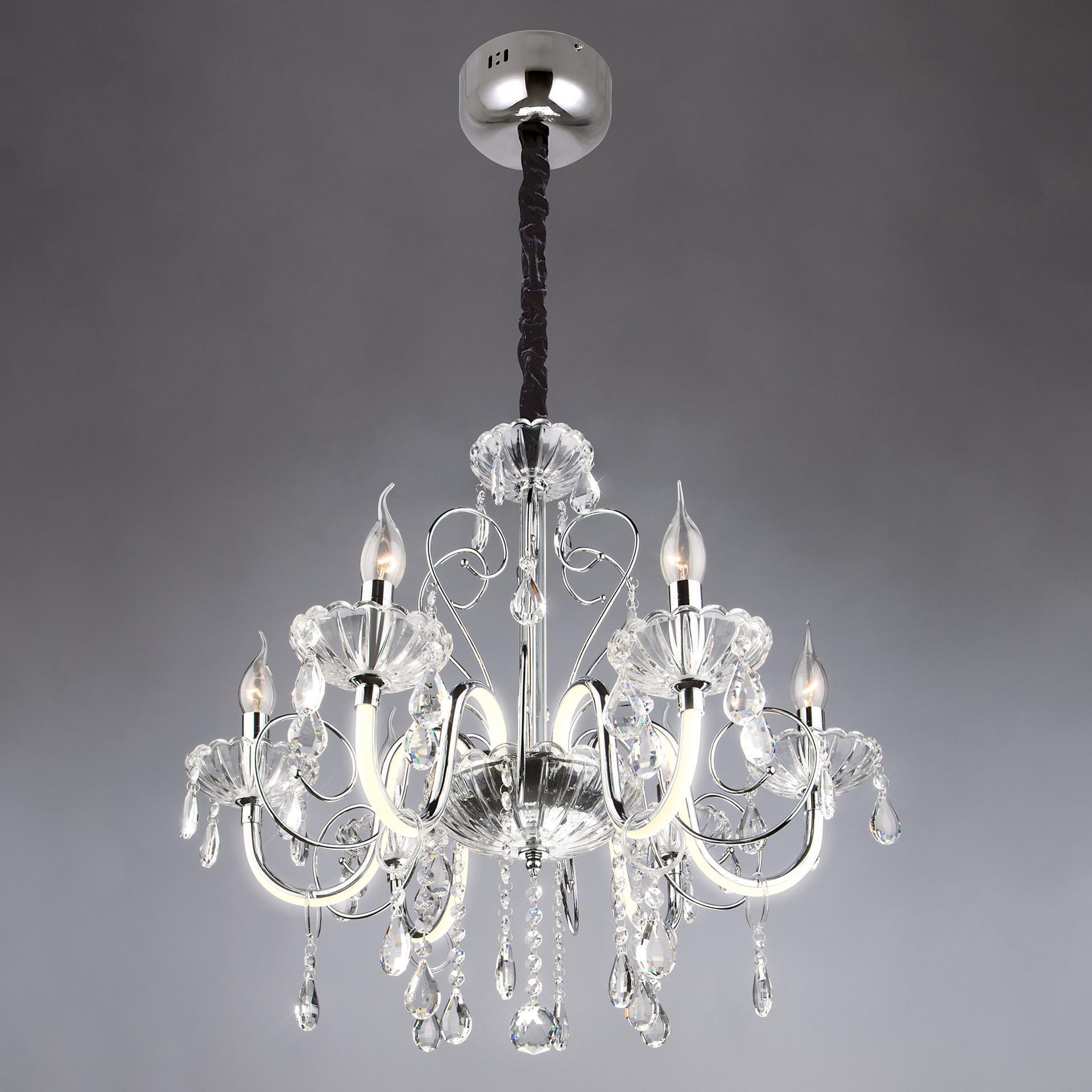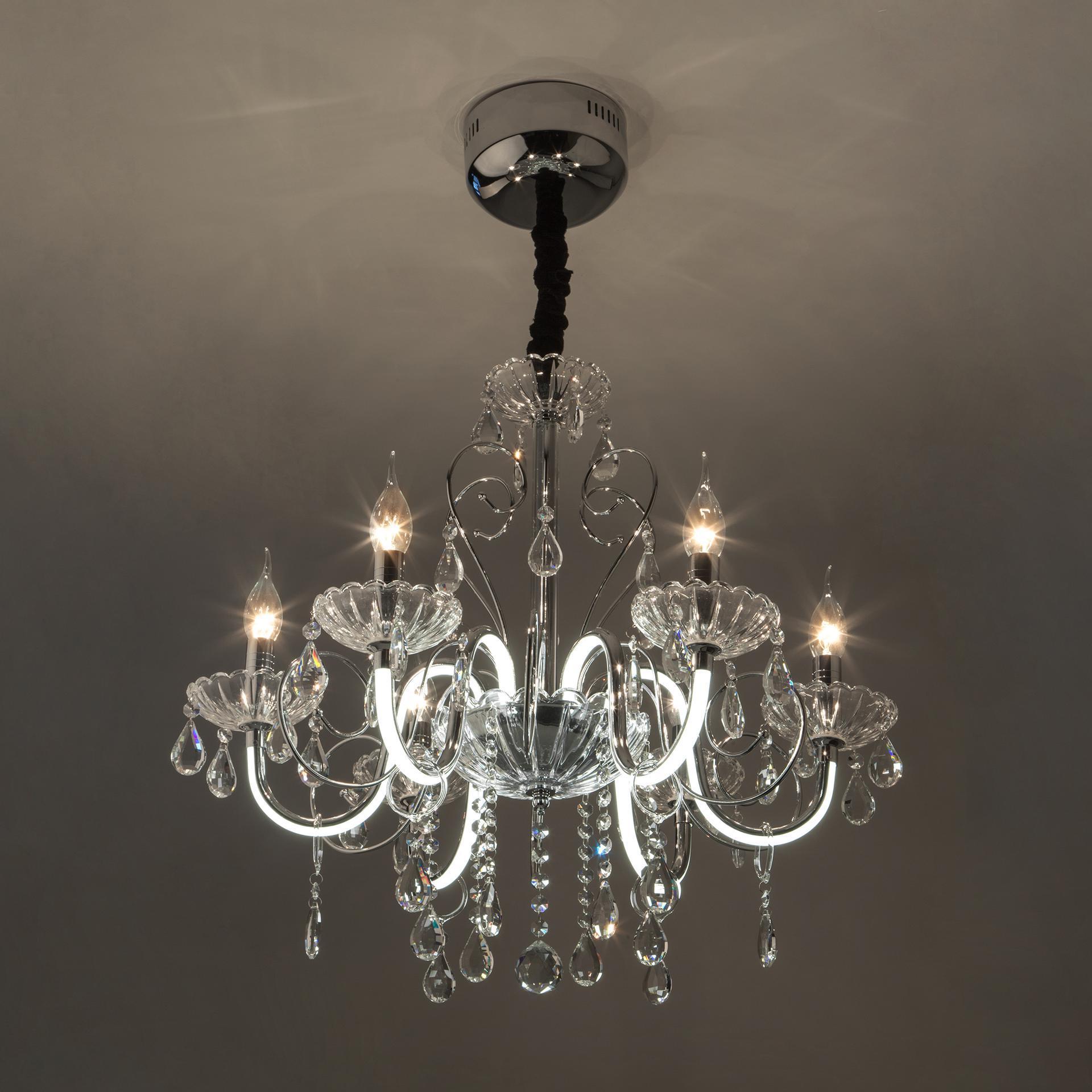 Светодиодная люстра с хрусталем и пультом 411/6 Strotskis в цвете хром преобразит потолочное пространство и создаст в вашем помещении комфортное полноценное освещение на площади 29 м кв. Изящные формы и классический стиль добавят вашей гостиной утонченного аристократизма. Декоративные рожки в виде подсвечников, украшенные сменными лампами с цоколем E14 типа свеча на ветру переливаются на свету яркими завораживающими бликами. Светодиодная люстра оснащена пультом управления, который имеет 3 режима, возможность включения подсветки отдельно от основных источников света. В производстве подвесной люстры использовали особое стекло с эффектной огранкой и высококачественный металл с надежным защитным покрытием. В нашем интернет-магазине вы можете купить подвесную хрустальную люстру по выгодной цене с доставкой по Москве и России.