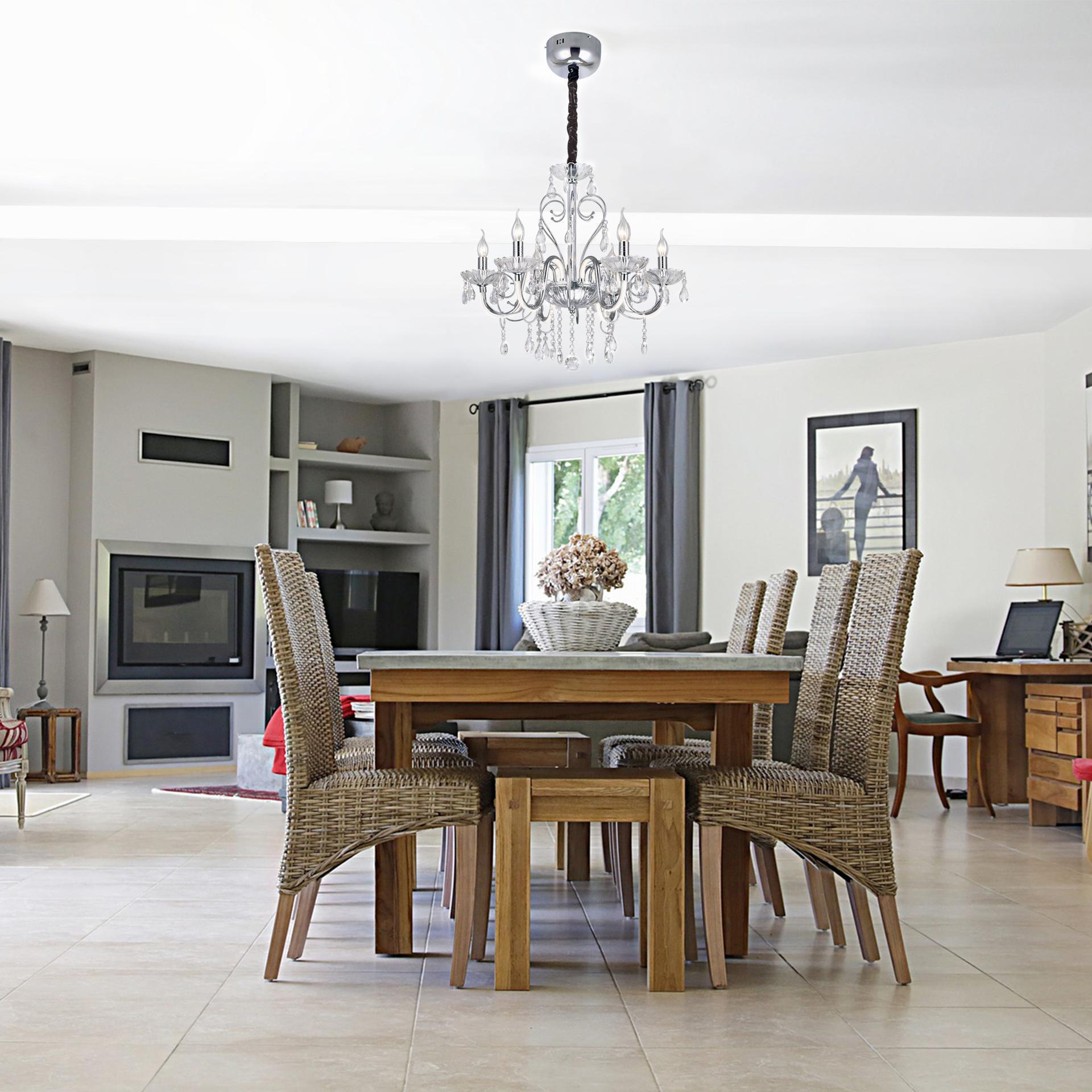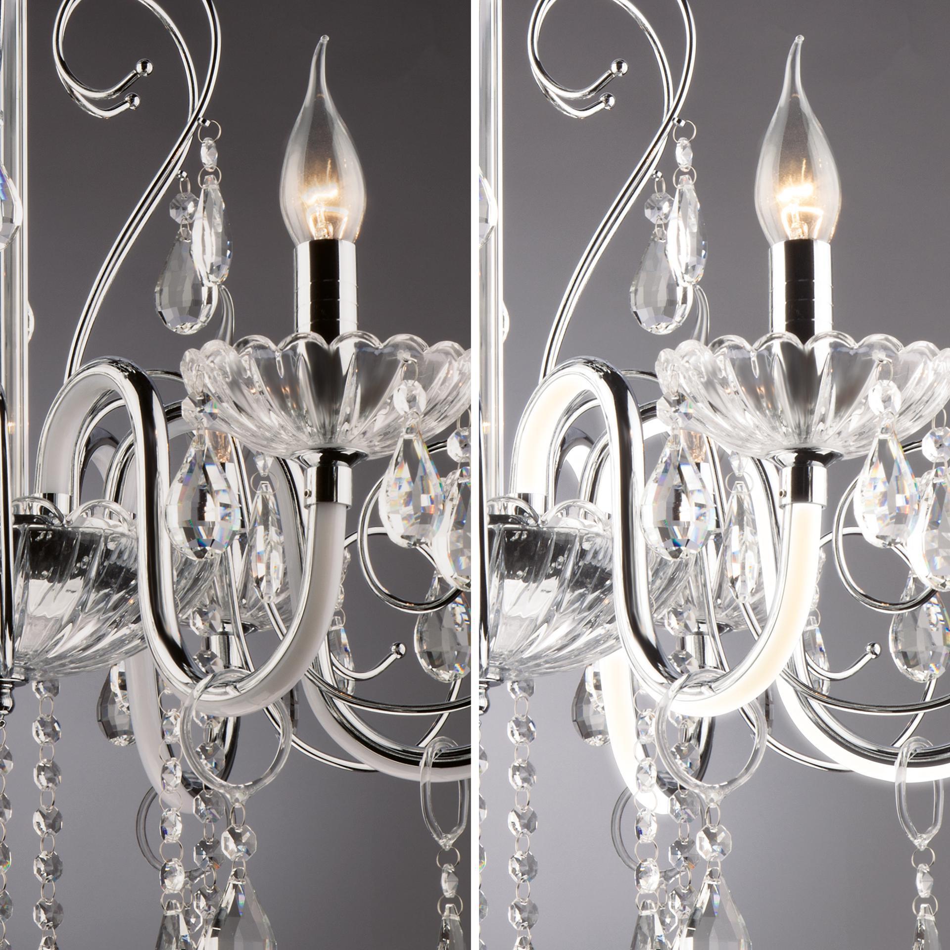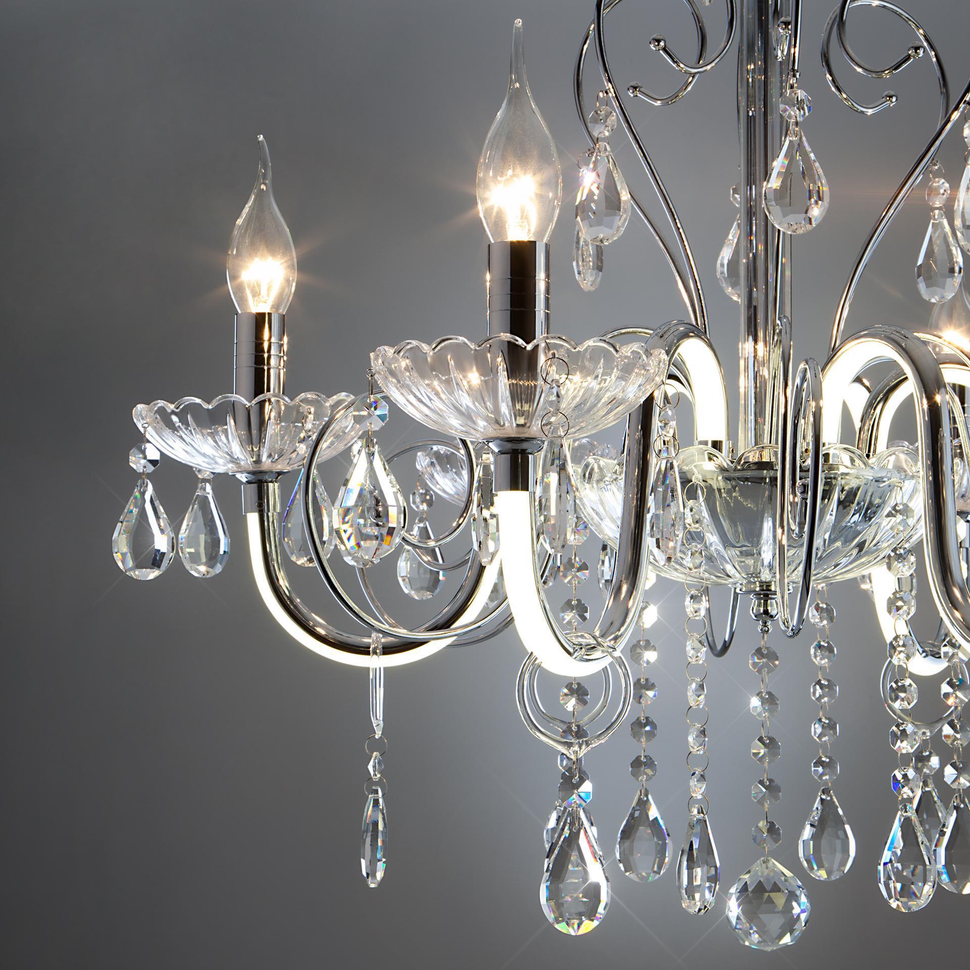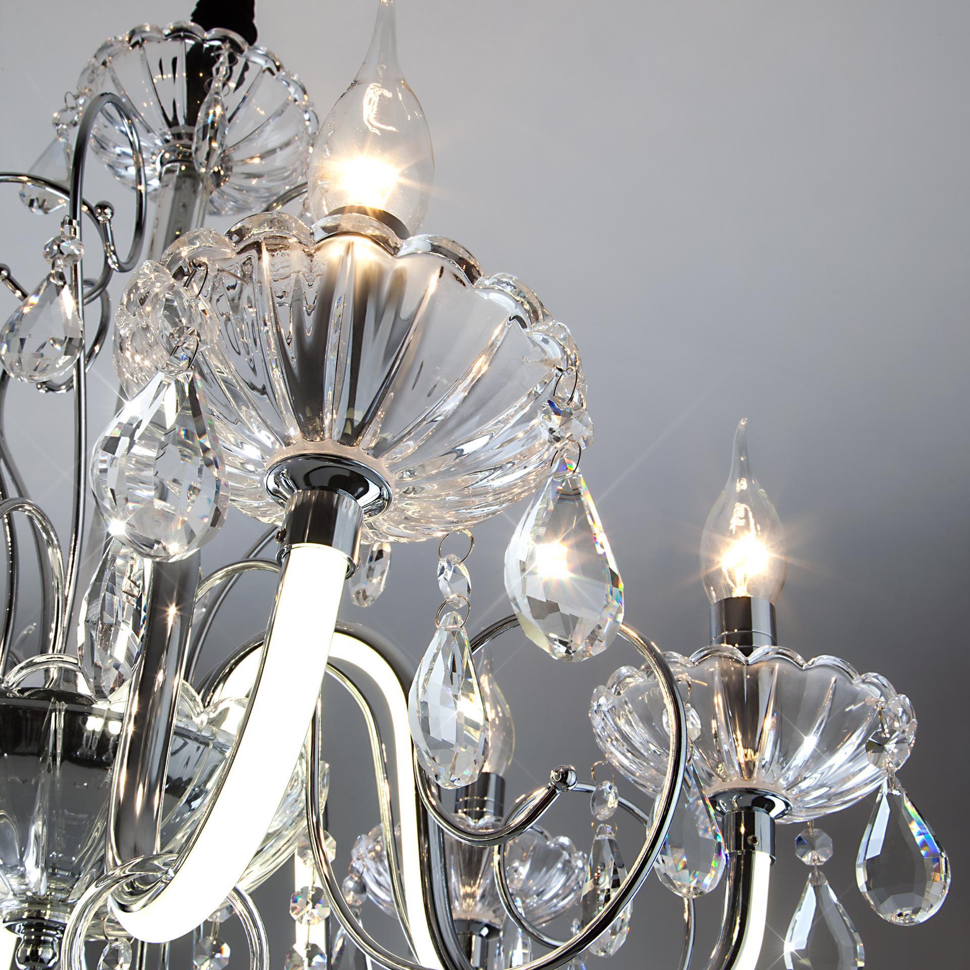 Светодиодная люстра с хрусталем и пультом 411/6 Strotskis в цвете хром преобразит потолочное пространство и создаст в вашем помещении комфортное полноценное освещение на площади 29 м кв. Изящные формы и классический стиль добавят вашей гостиной утонченного аристократизма. Декоративные рожки в виде подсвечников, украшенные сменными лампами с цоколем E14 типа свеча на ветру переливаются на свету яркими завораживающими бликами. Светодиодная люстра оснащена пультом управления, который имеет 3 режима, возможность включения подсветки отдельно от основных источников света. В производстве подвесной люстры использовали особое стекло с эффектной огранкой и высококачественный металл с надежным защитным покрытием. В нашем интернет-магазине вы можете купить подвесную хрустальную люстру по выгодной цене с доставкой по Москве и России.