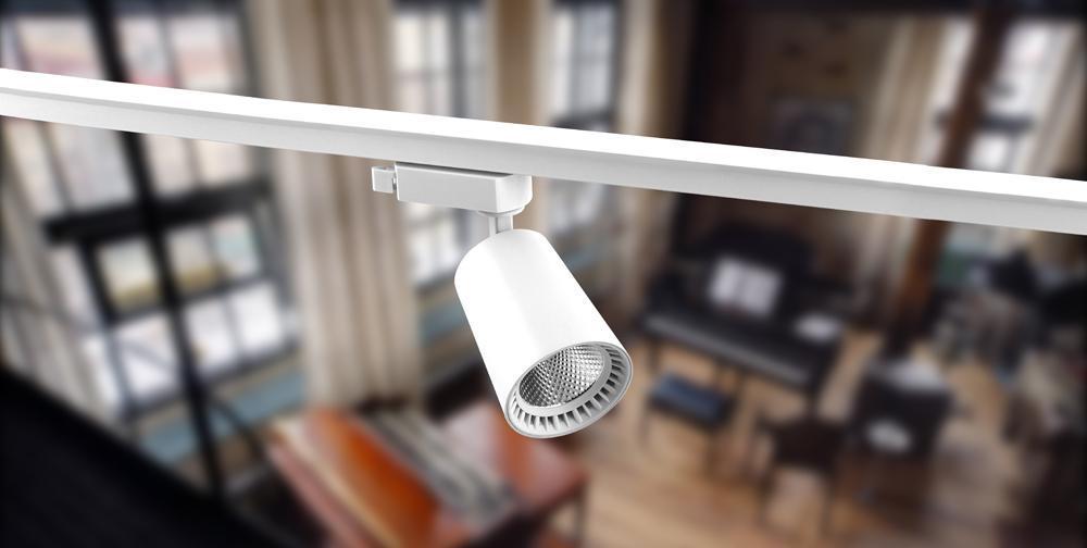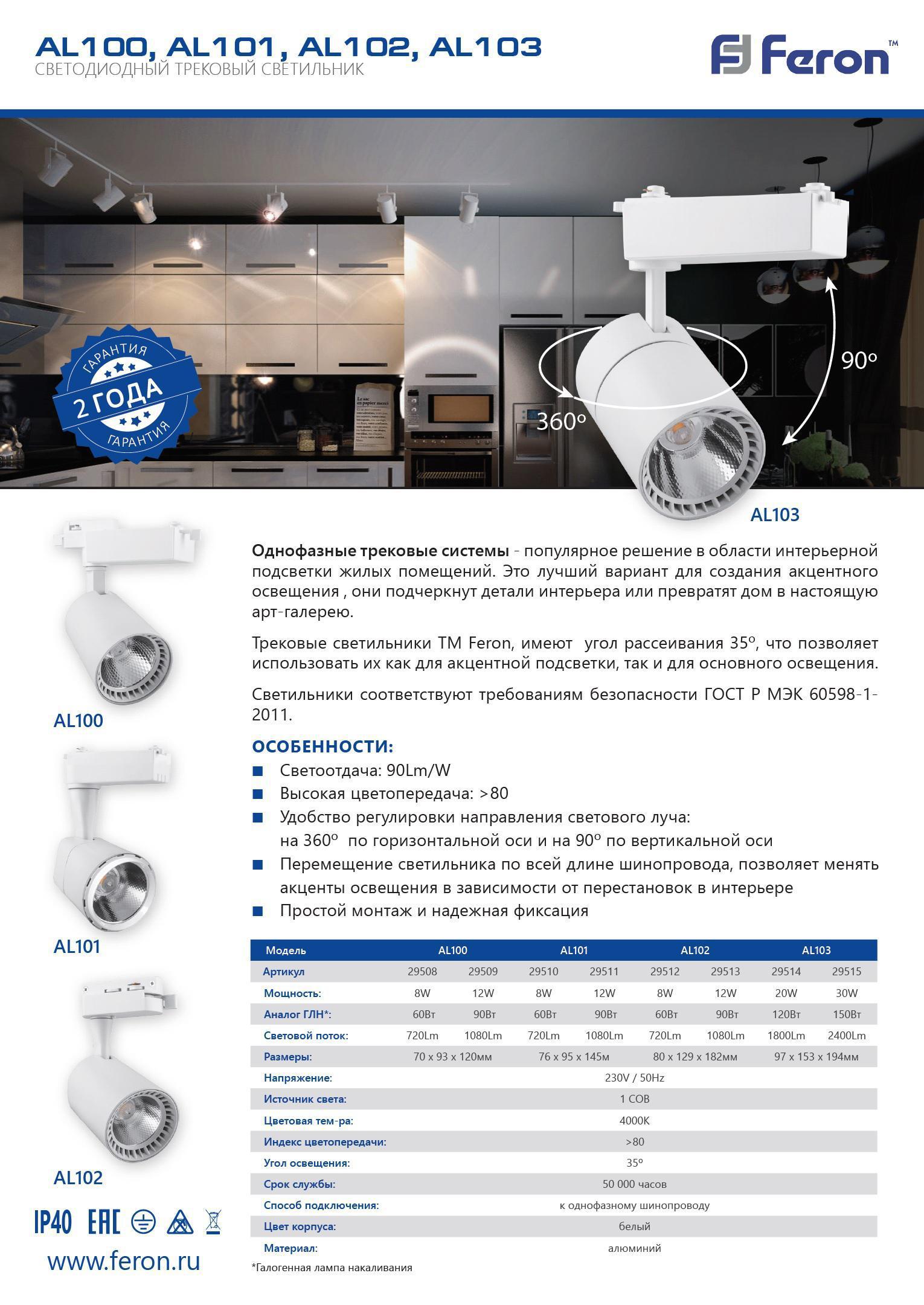 Светильник трековый светодиодный на шинопровод, однофазный (ДПО) FERON AL102, 8W, 4000К (белый), 230V, 720Lm, угол освещения 35°, цвет белый, корпус алюминий, рассеиватель поликарбонат, вращение →360°/↓90°, 80*129*182 мм