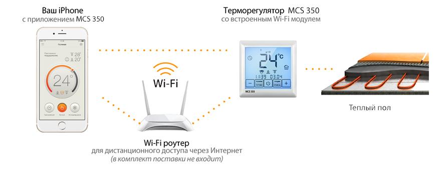 Дистанционное управление обогревом пола осуществляется по сети Wi-Fi напрямую со смартфона с установленным приложением MCS 350 или через домашний Wi-Fi роутер. Wi-Fi роутер в комплект поставки терморегулятора не входит.