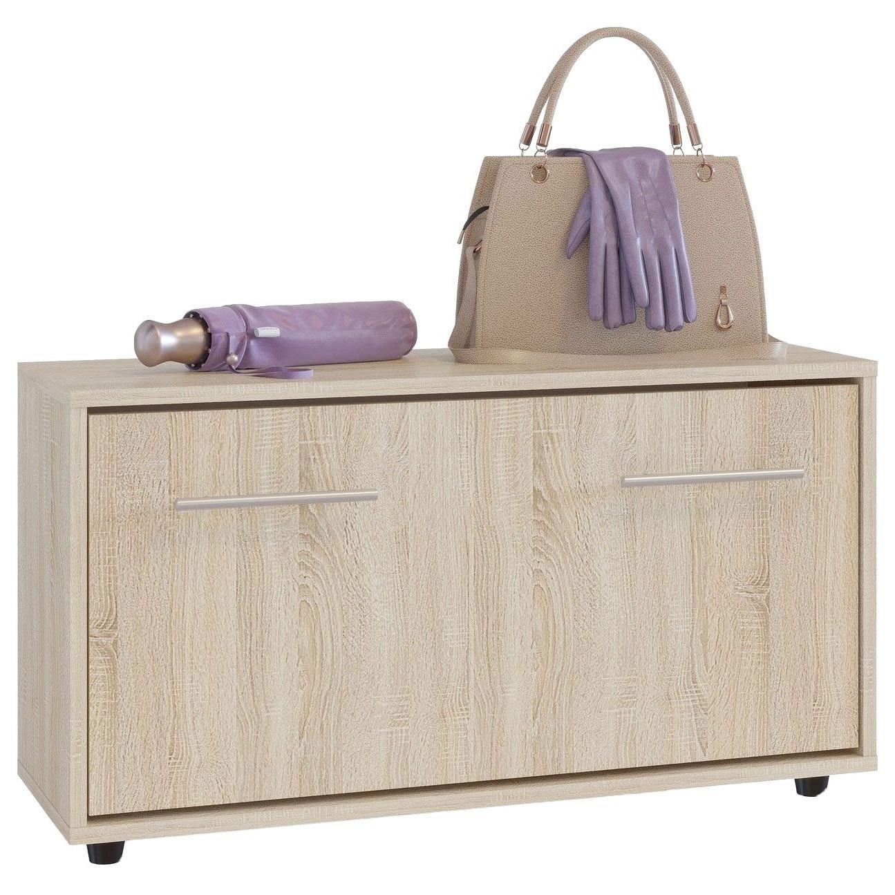 Широкая низкая тумба для обуви. Дверь оснащена откидывающимся механизмом со специальными полками для размещения обуви, который обеспечивает удобство хранения и легкий доступ к необходимой паре кроссовок или туфель.