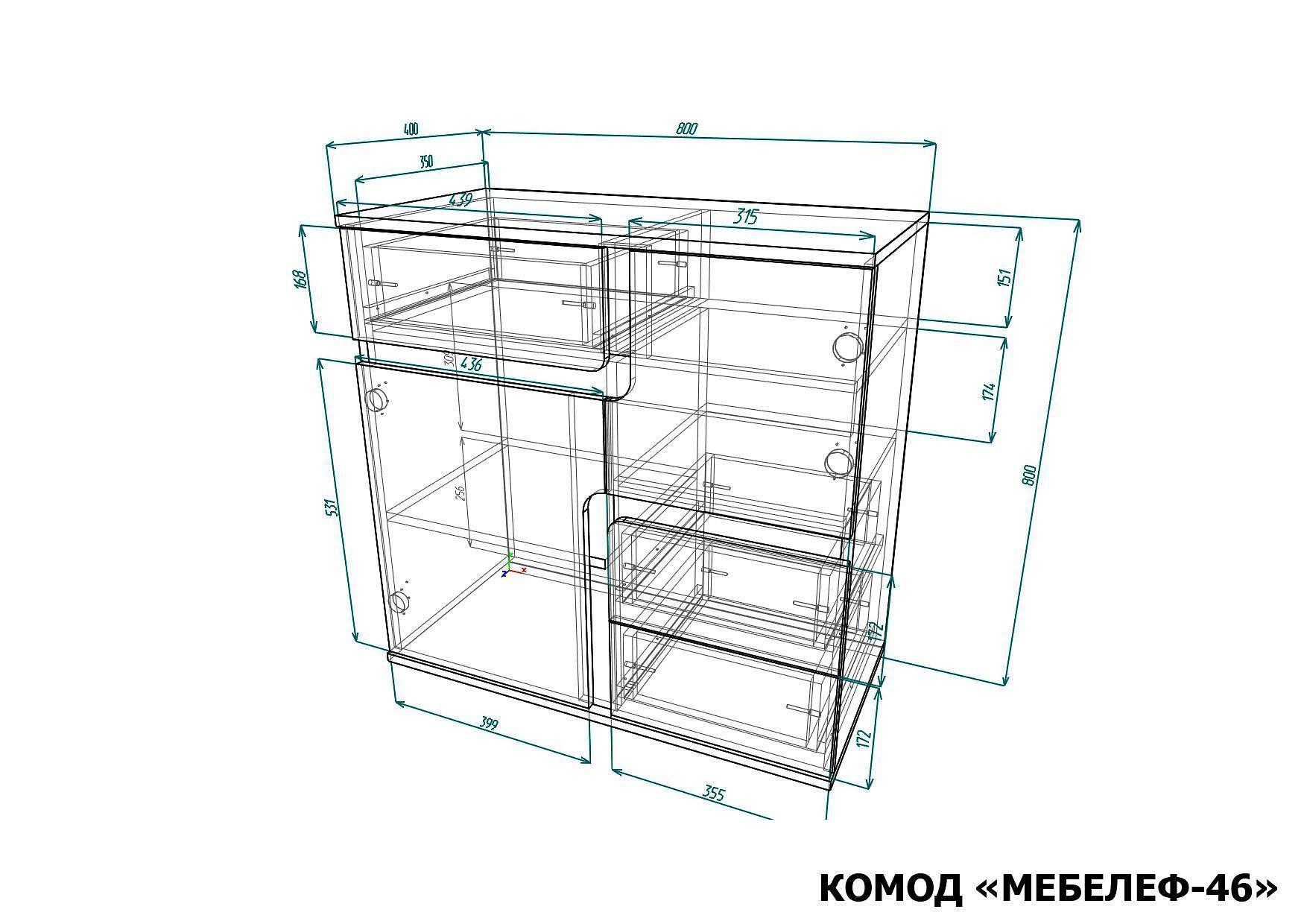 2 дверцы, 2 полки, 3 ящика