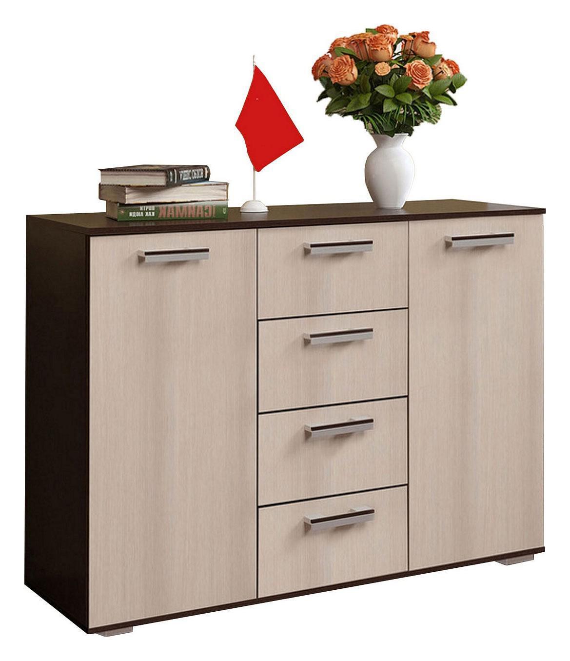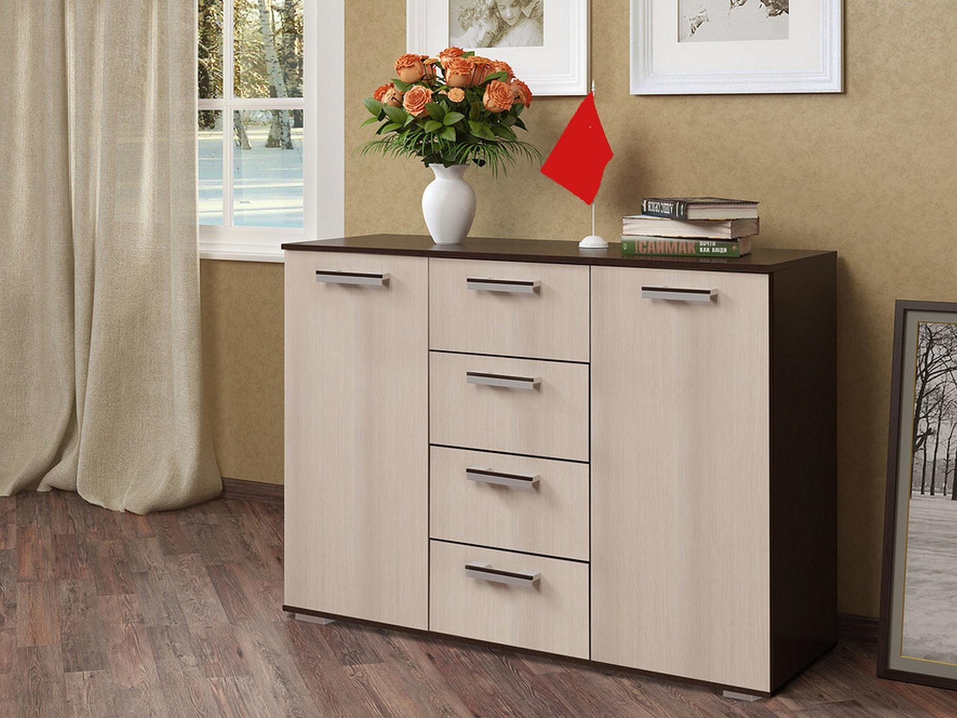 Функциональную систему хранения тумбы образуют четыре выдвижных ящика и два больших отделения с распашными дверцами. Такое наполнение поможет организовать удобное хранение множества предметов.